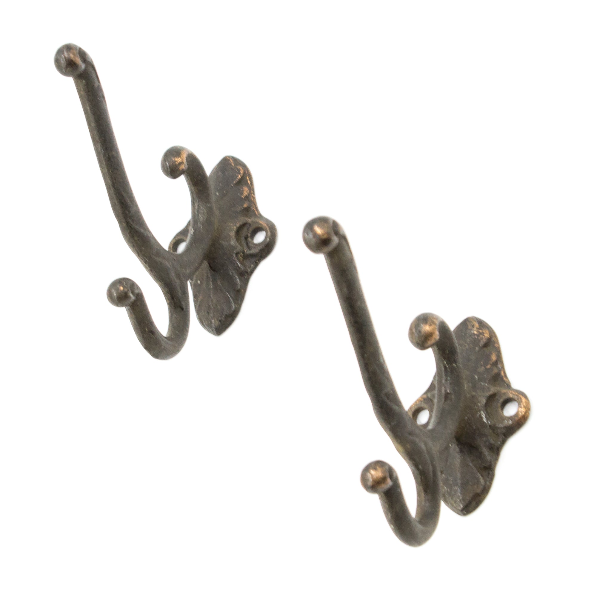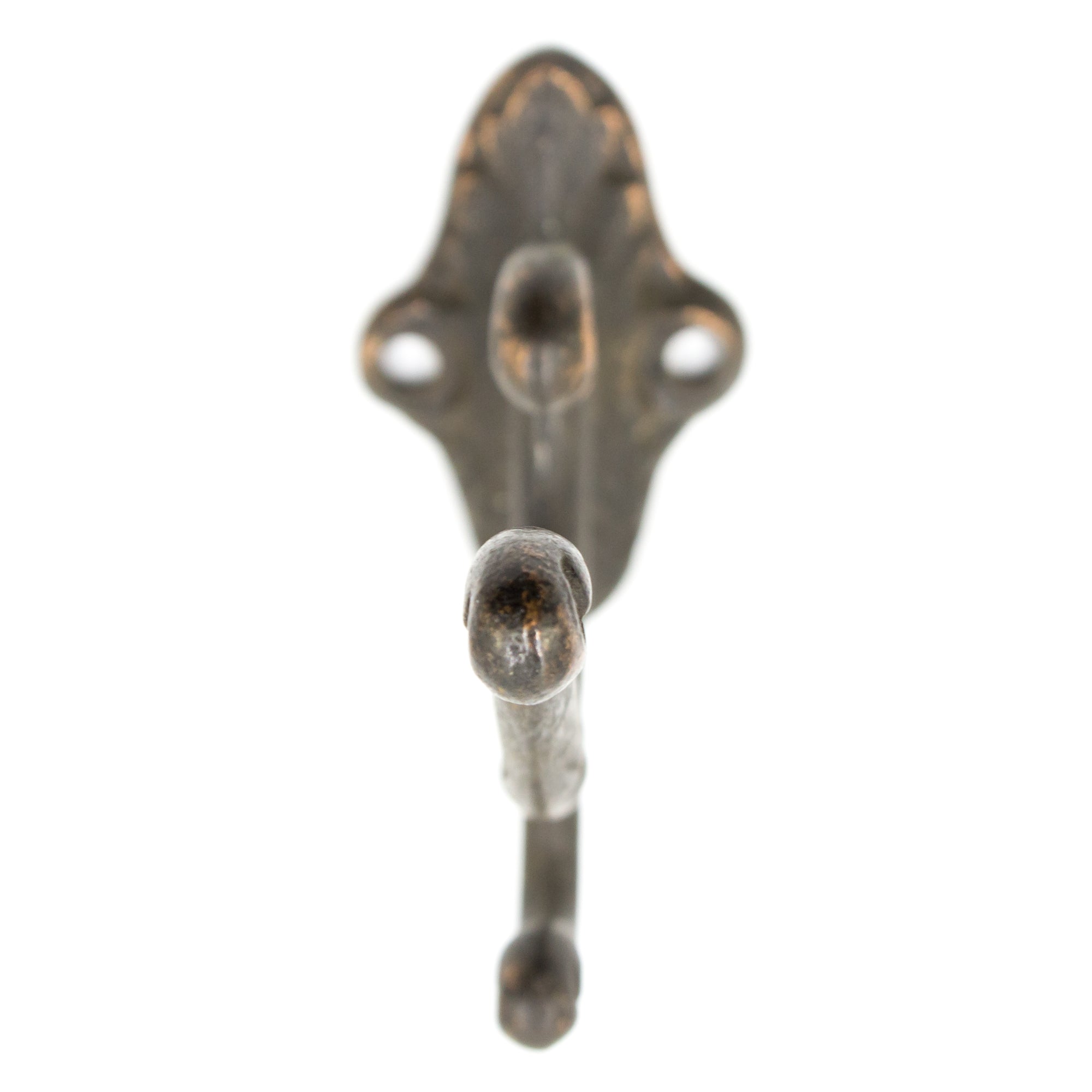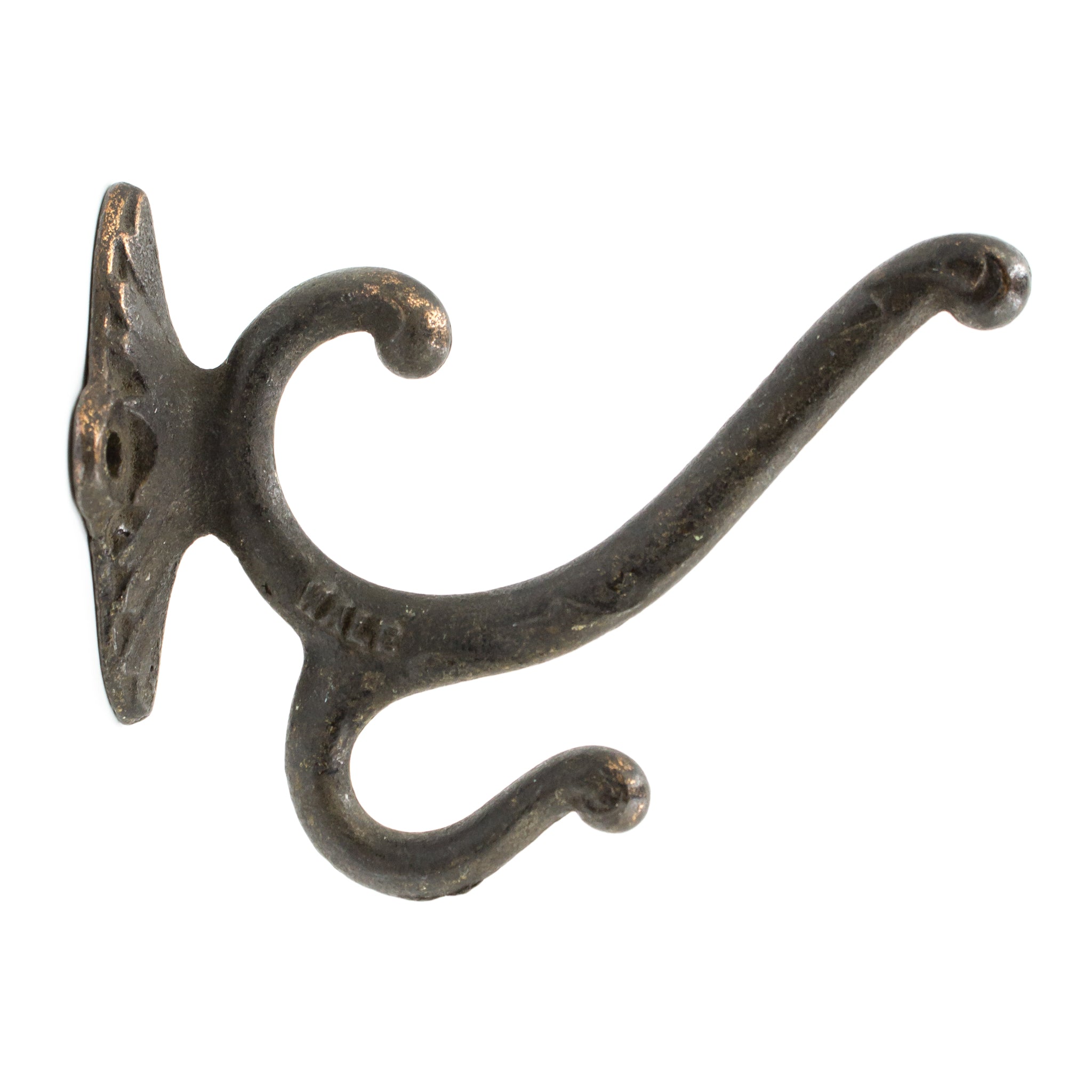 Graceful cast iron hooks like these deserve a spot on the wall, hook rack, or anywhere you see fit. Tidy up the place with a bit of old time charm! Small bits of copper flash japan finish are still visible. HALE is stamped into the sides and is visible. Sold individually.