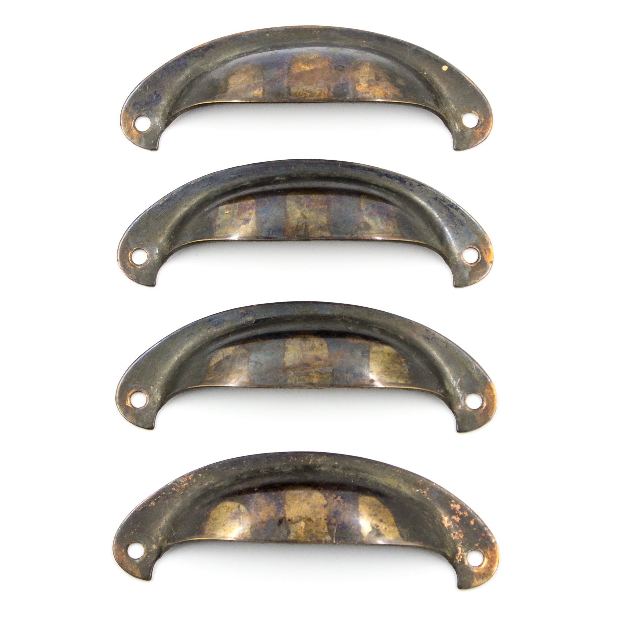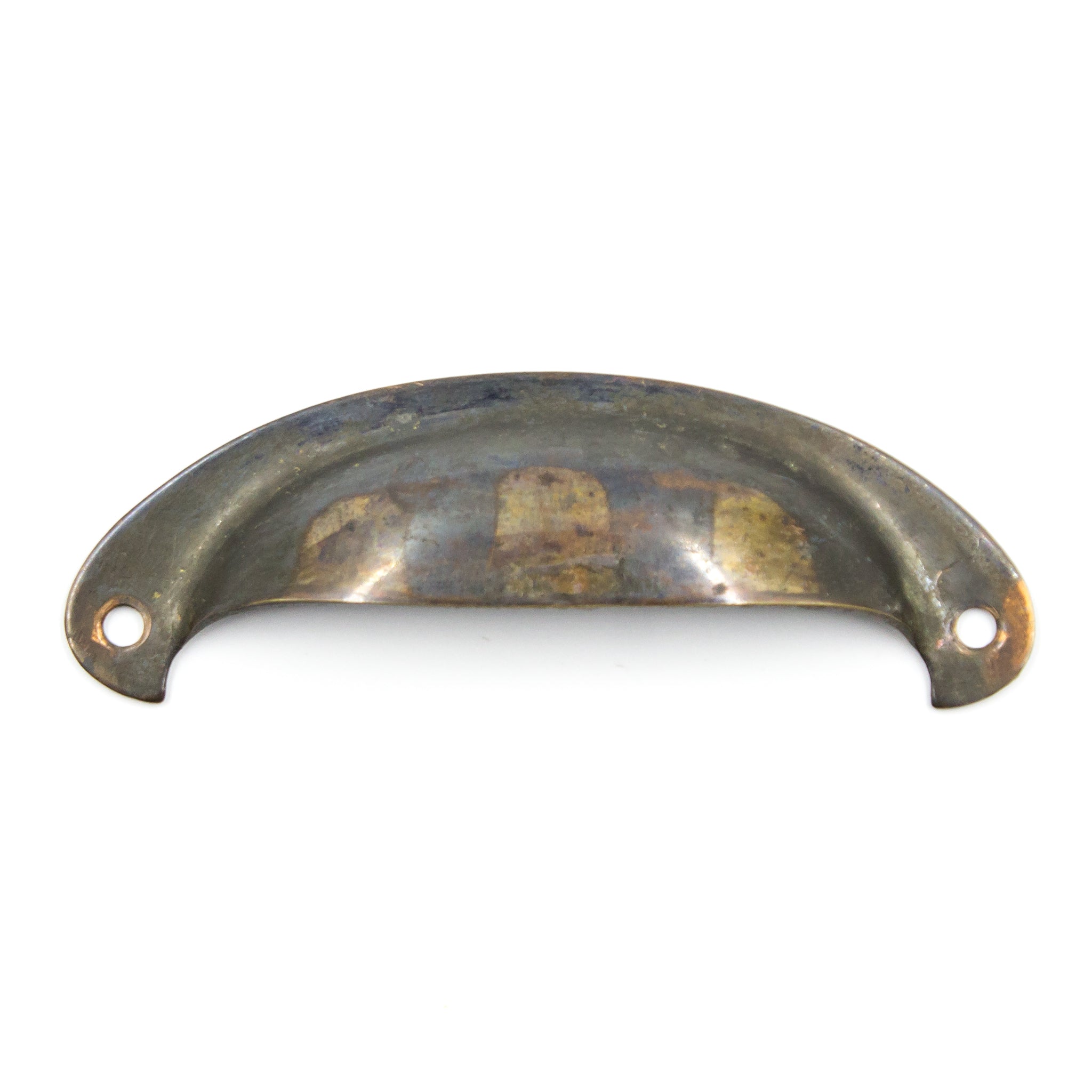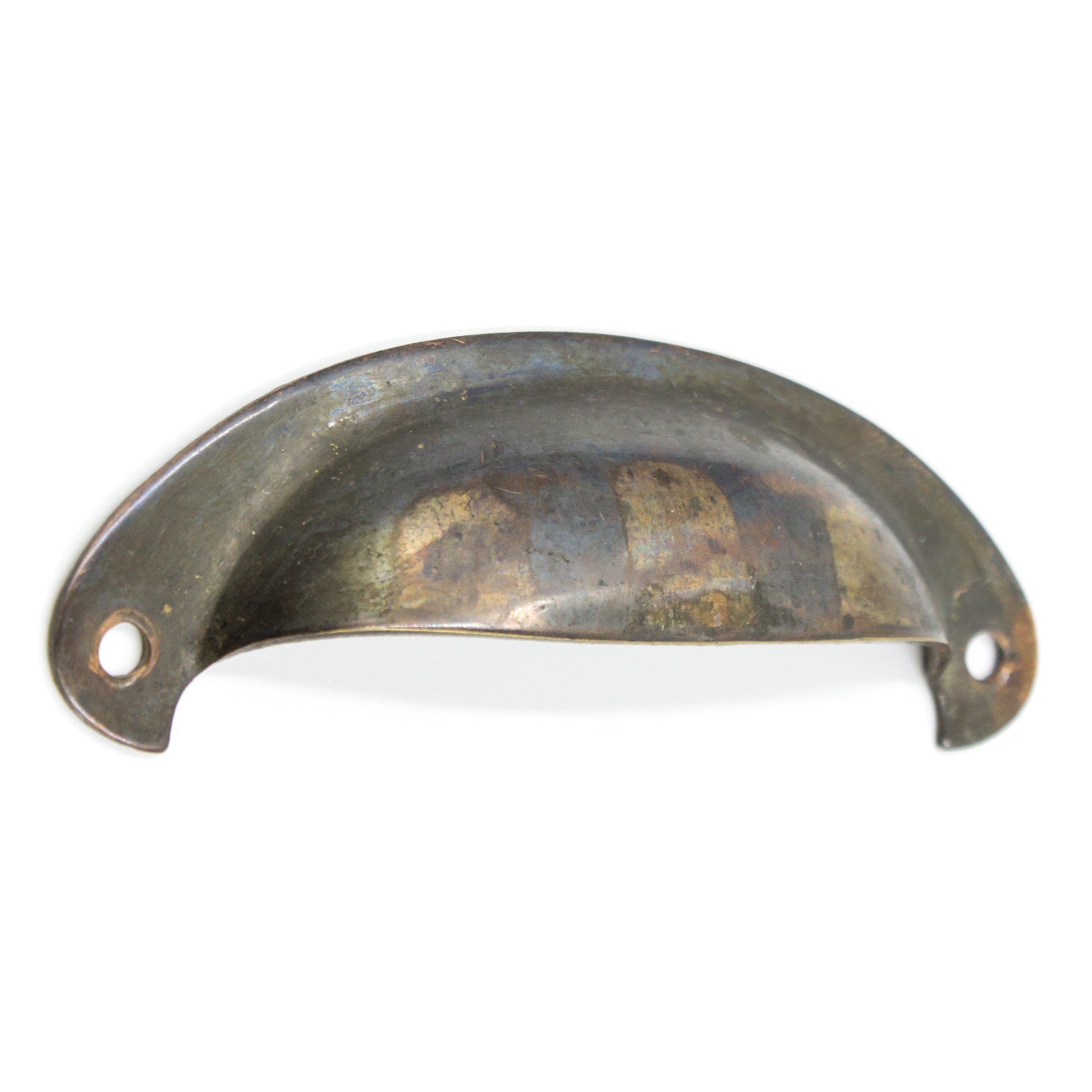 These are great transitional bin pulls from the very end of the Victorian era, likely used in working class or industrial location. In these pulls we see the influence of Nouveau with the rounded edges. Made of stamped steel with Copper flash or 'Japan' surface treatment. Sold individually.