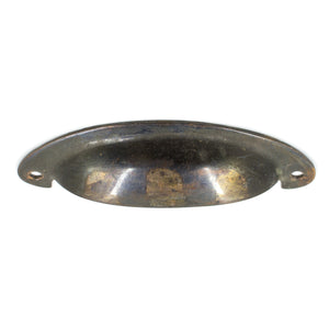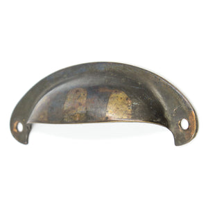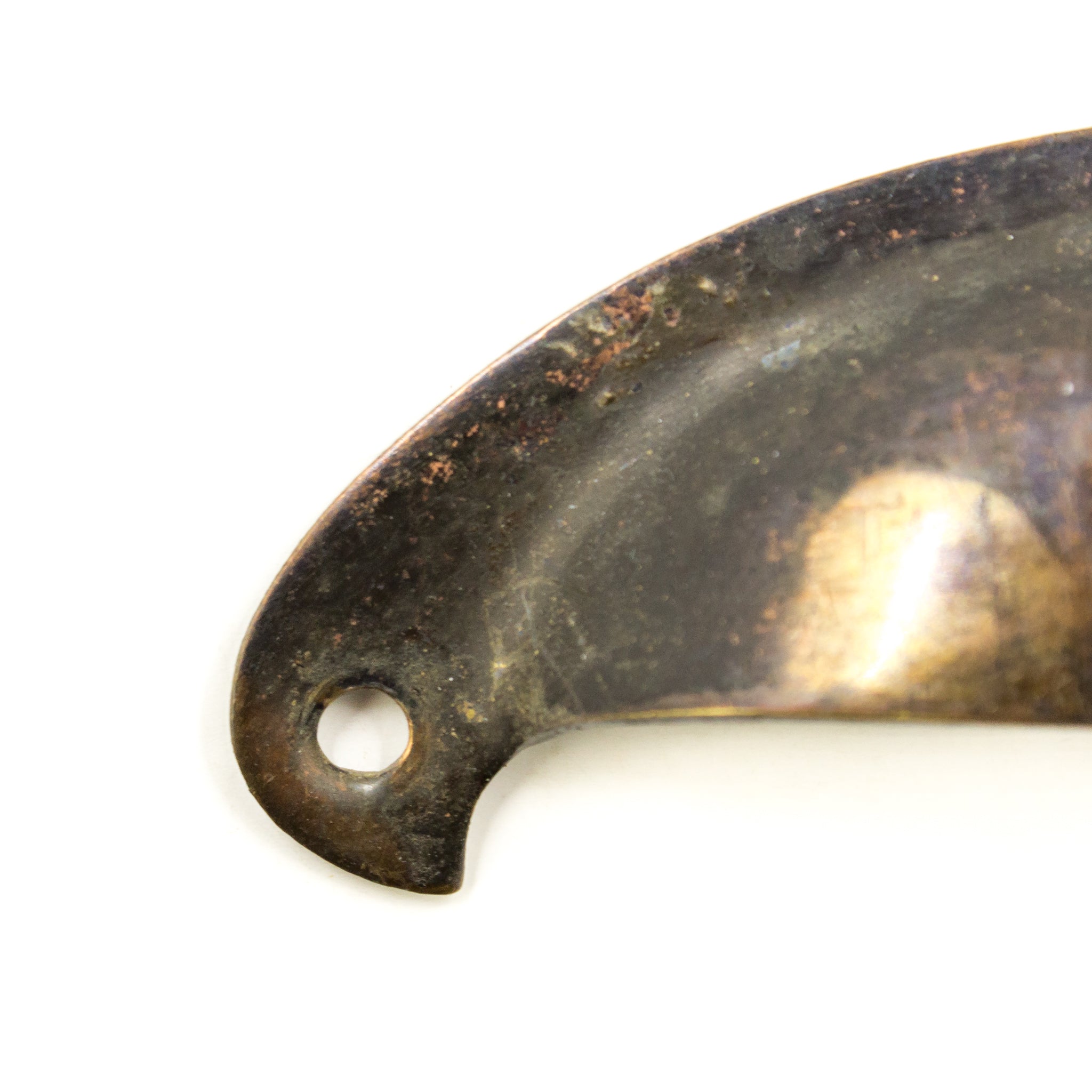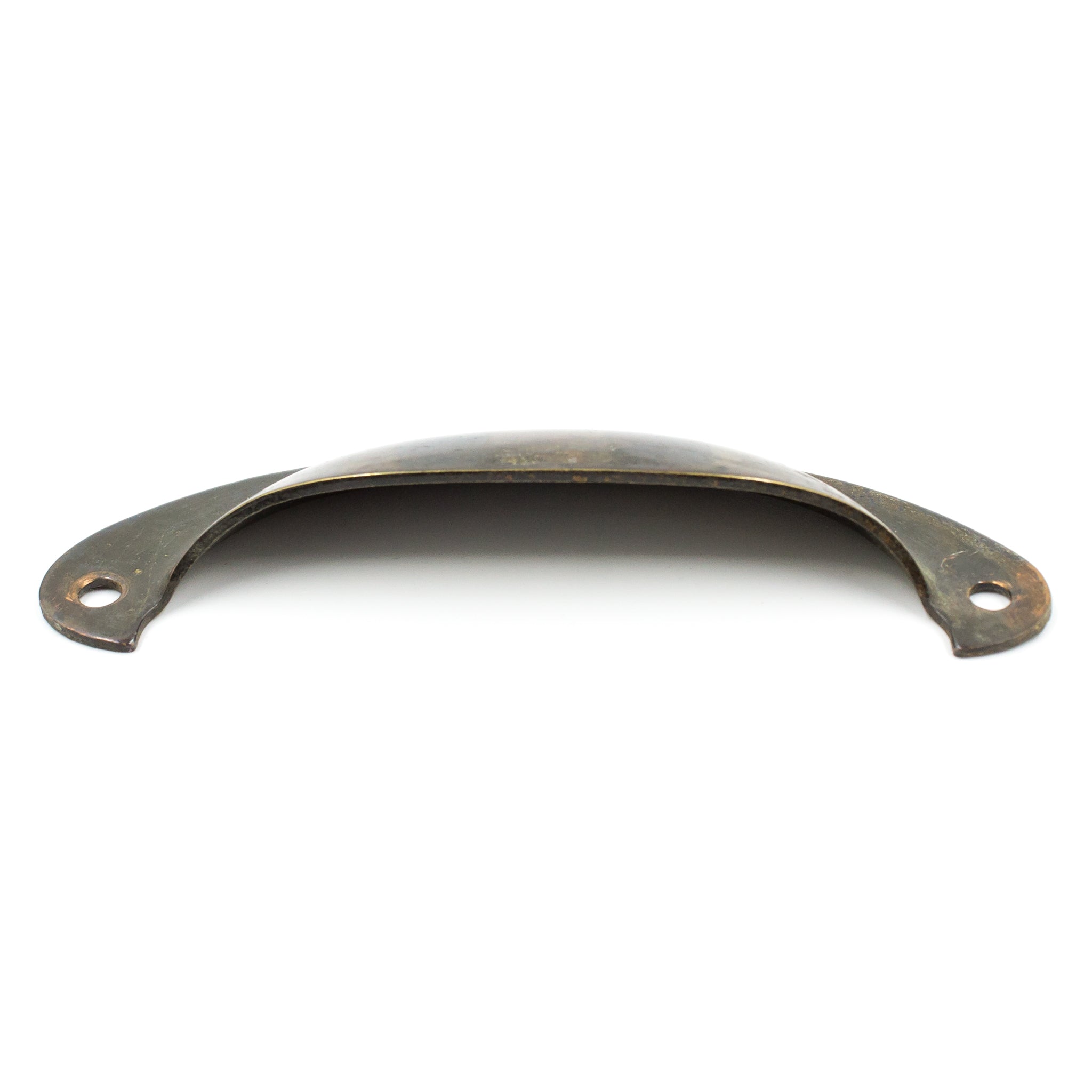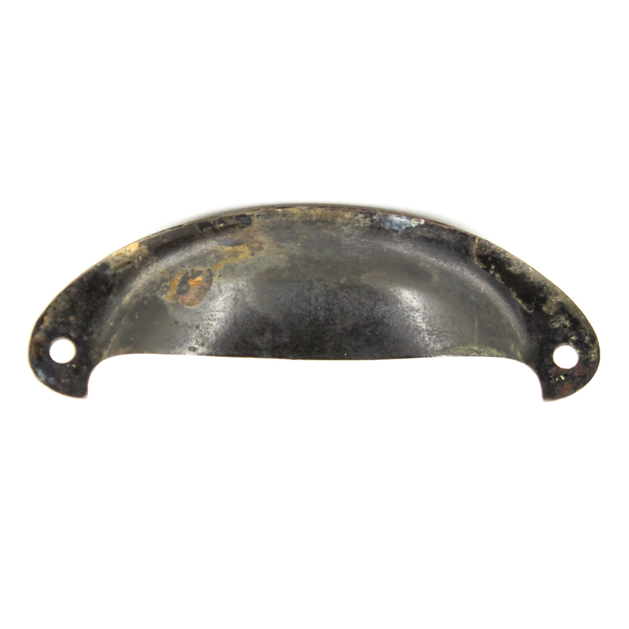These are great transitional bin pulls from the very end of the Victorian era, likely used in working class or industrial location. In these pulls we see the influence of Nouveau with the rounded edges. Made of stamped steel with Copper flash or 'Japan' surface treatment. Sold individually.