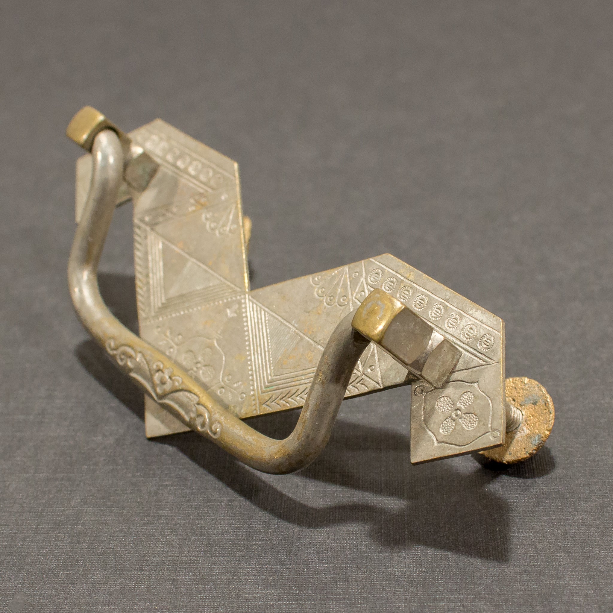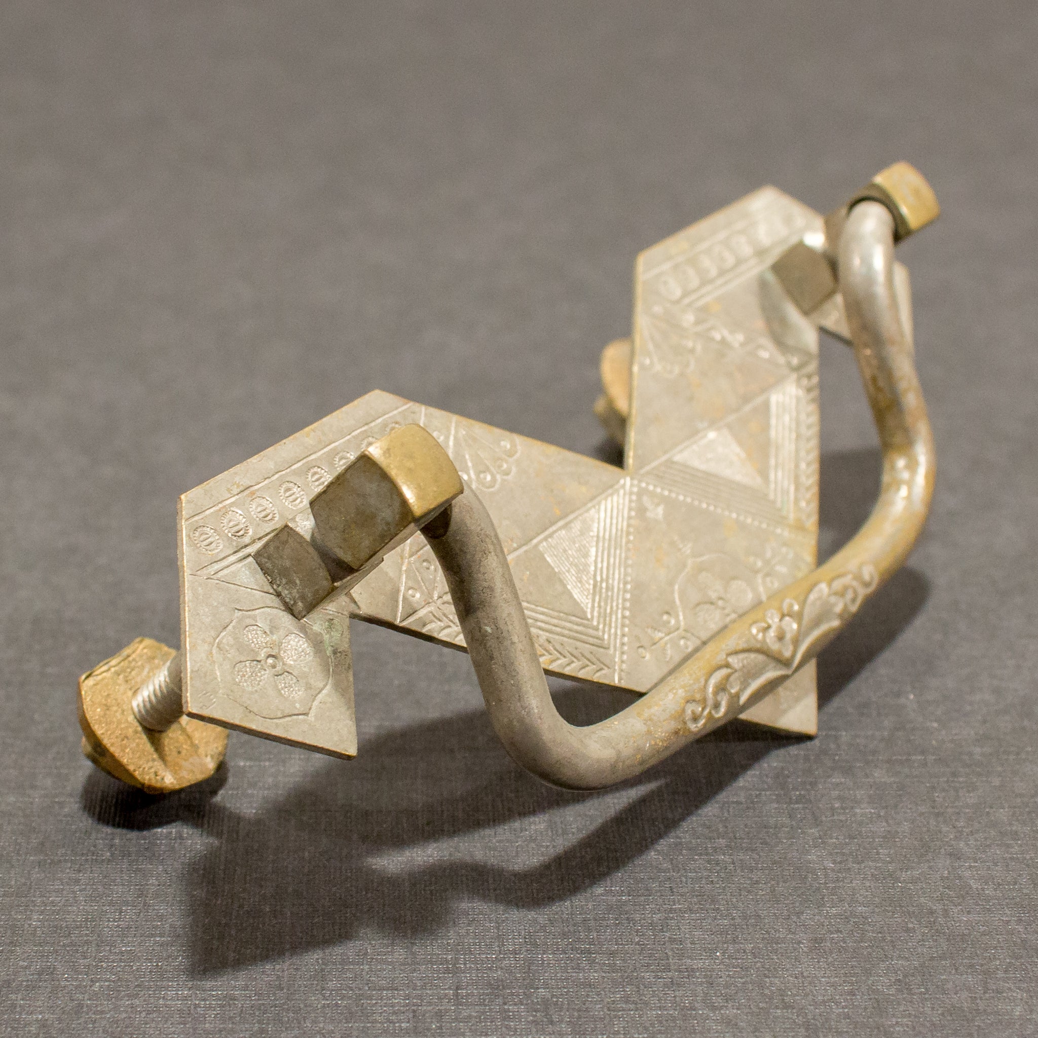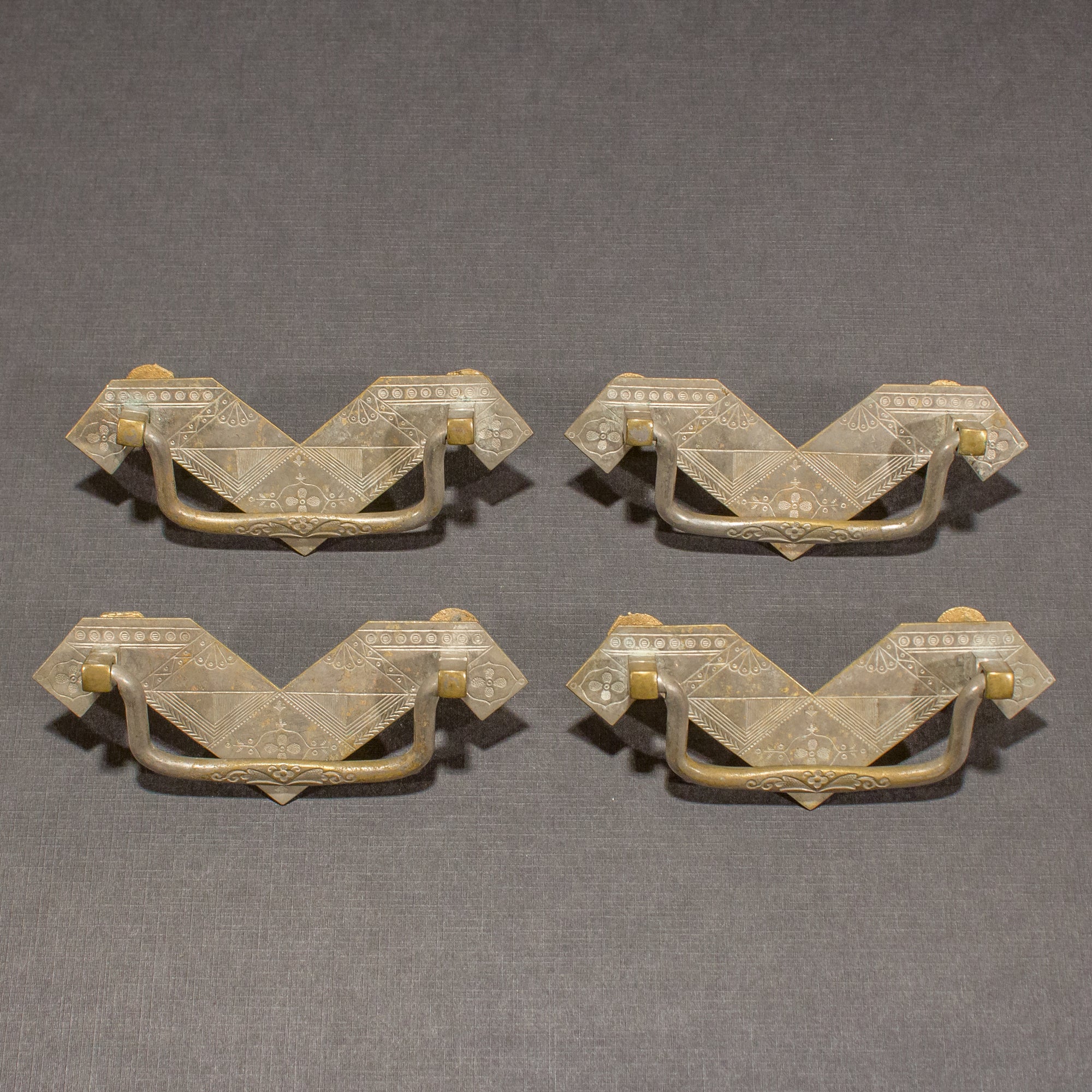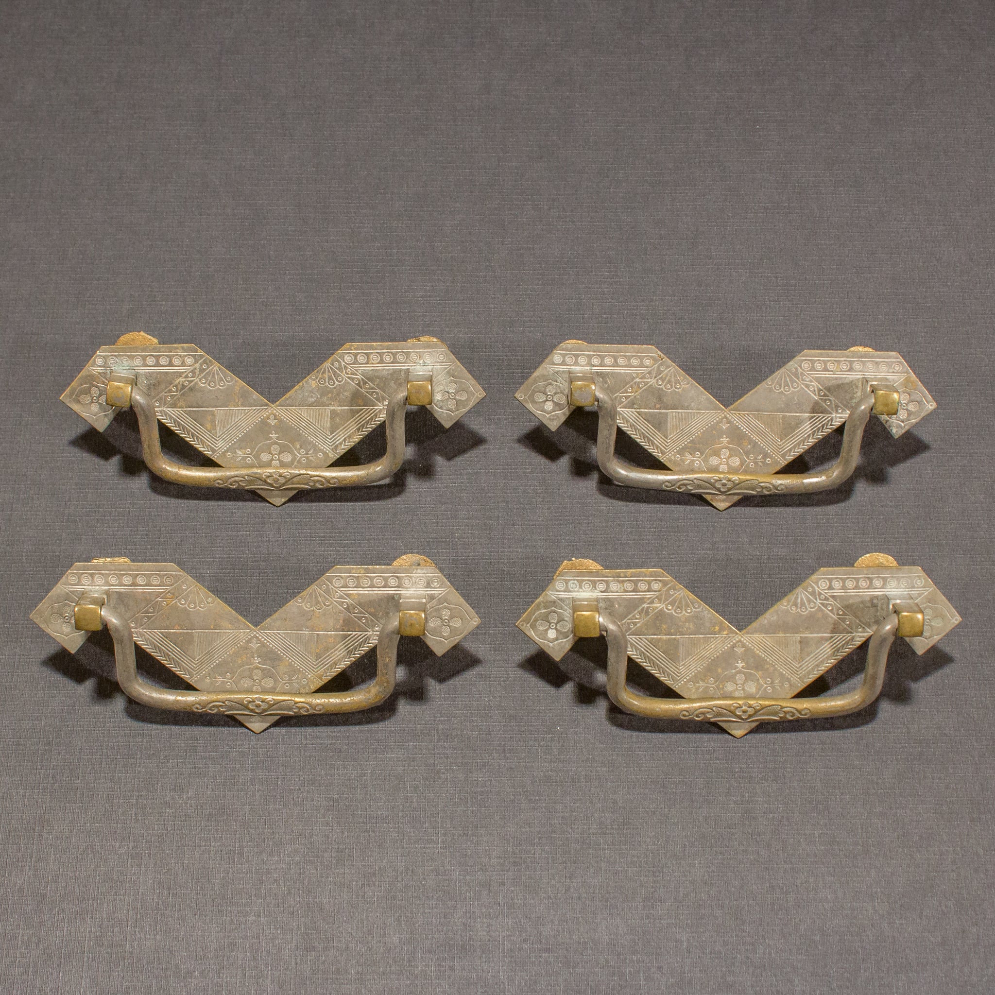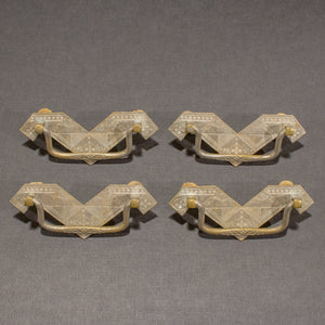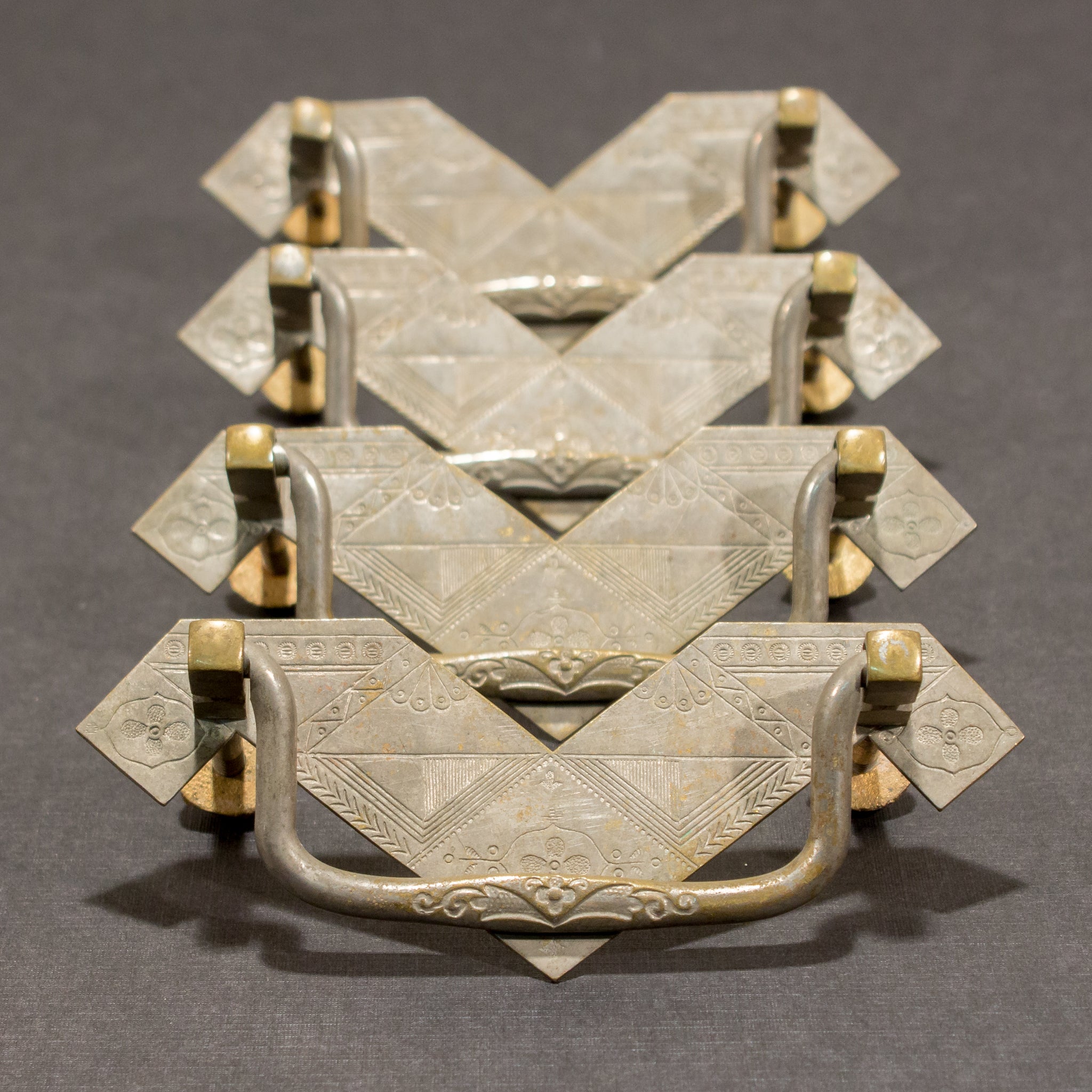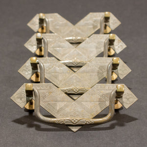 Delicate floral and geometric pattern, thin but sturdy material stamped brass make up these lovely Victorian bail pulls. Perfect for a small set of drawers, these pulls will stand out. Made of stamped brass. Sold individually.