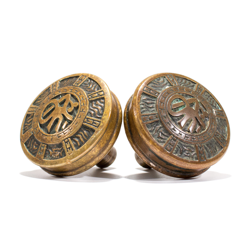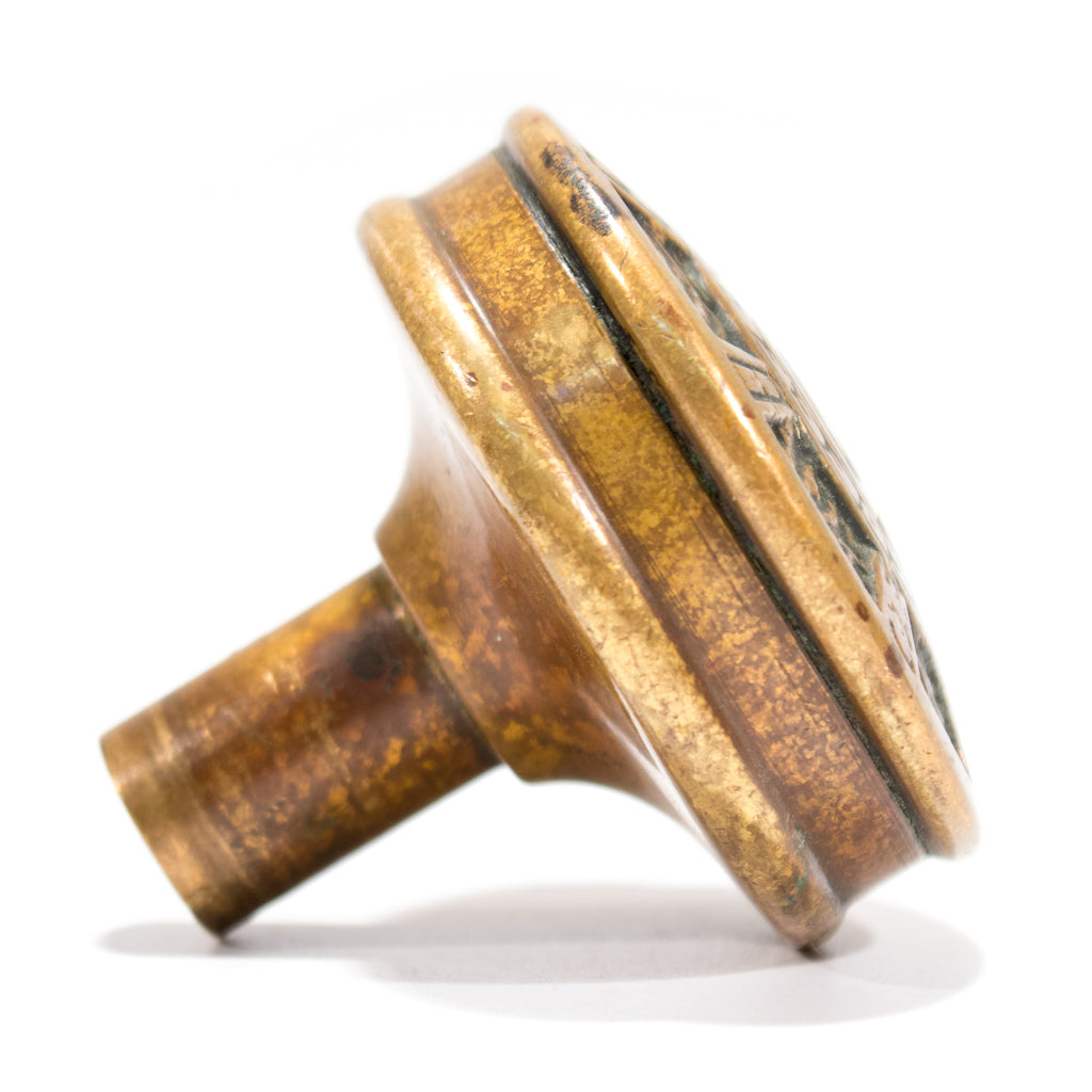 Made by Mallory Wheeler circa 1880, this set is remarkably ornate featuring deep casting, drum knobs (instead of round), and a lovely varied patina. The Mallory Wheeler company was a prominent high end hardware manufacturer through most of the 1800's. This set is made of cast brass and includes two knobs and two plates.