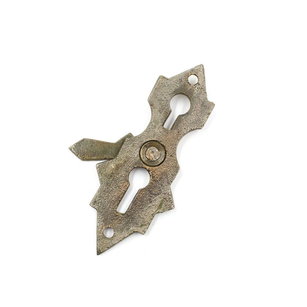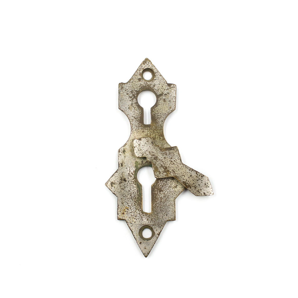 Geometric and unusually unornamented, this striking double keyhole cover would have been used in the Victorian era for an exterior door. A beautiful piece for decoration. Made of cast bronze with silver finish.