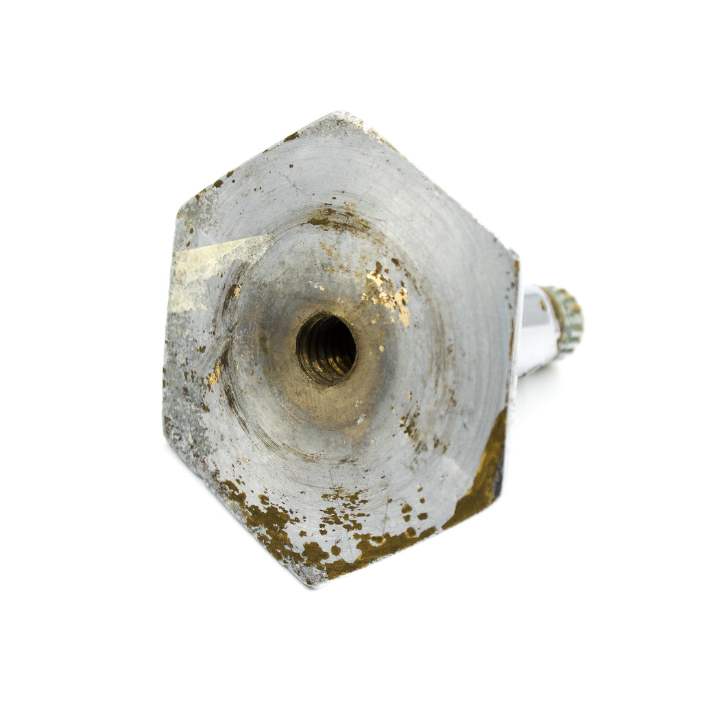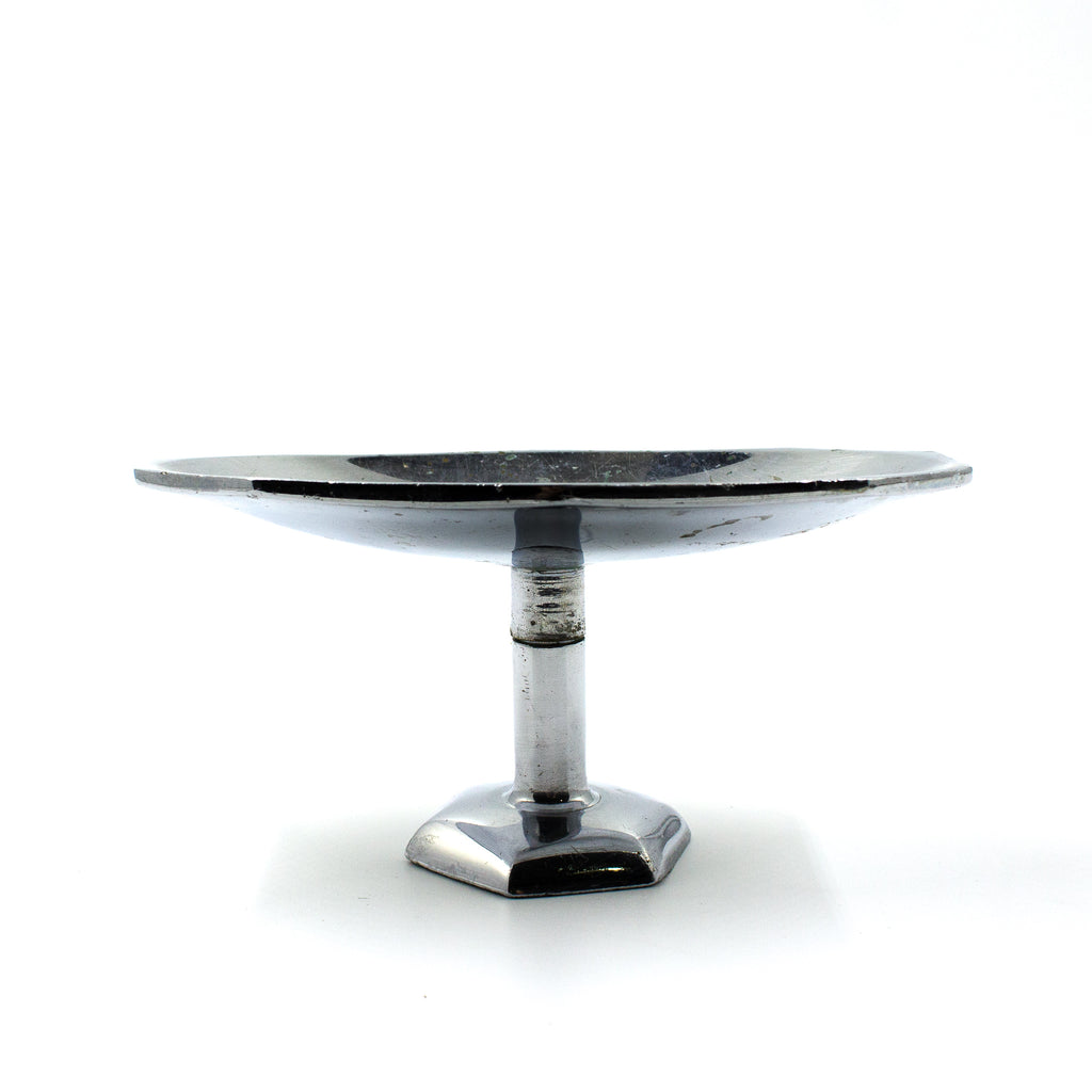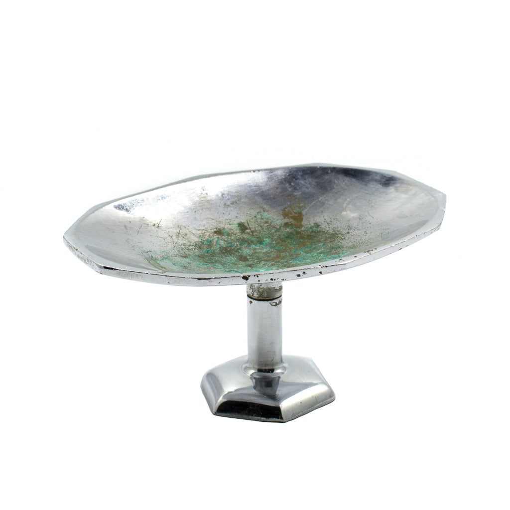 Excellent, angular deco soap dish with a bolt-through mount for any counter top, kitchen sink, or bathroom sink. Made of chrome plated cast brass circa 1945.