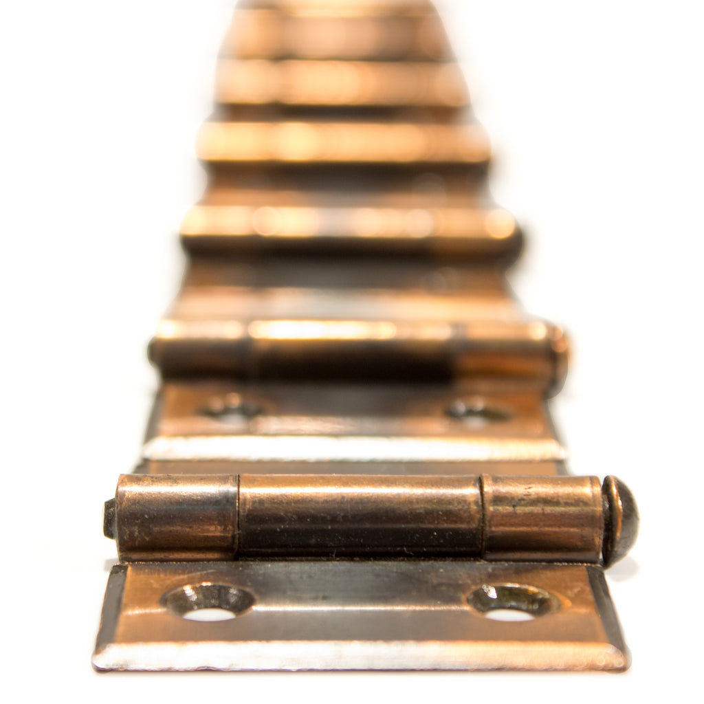 Gorgeous small butt tip cabinet hinges with iconic late Victorian copper and black Japan finish. Each hinge has a distinctive sharp bevel around the edge, signaling the transition into mission style. These hinges are new old stock, never installed. Sold individually.