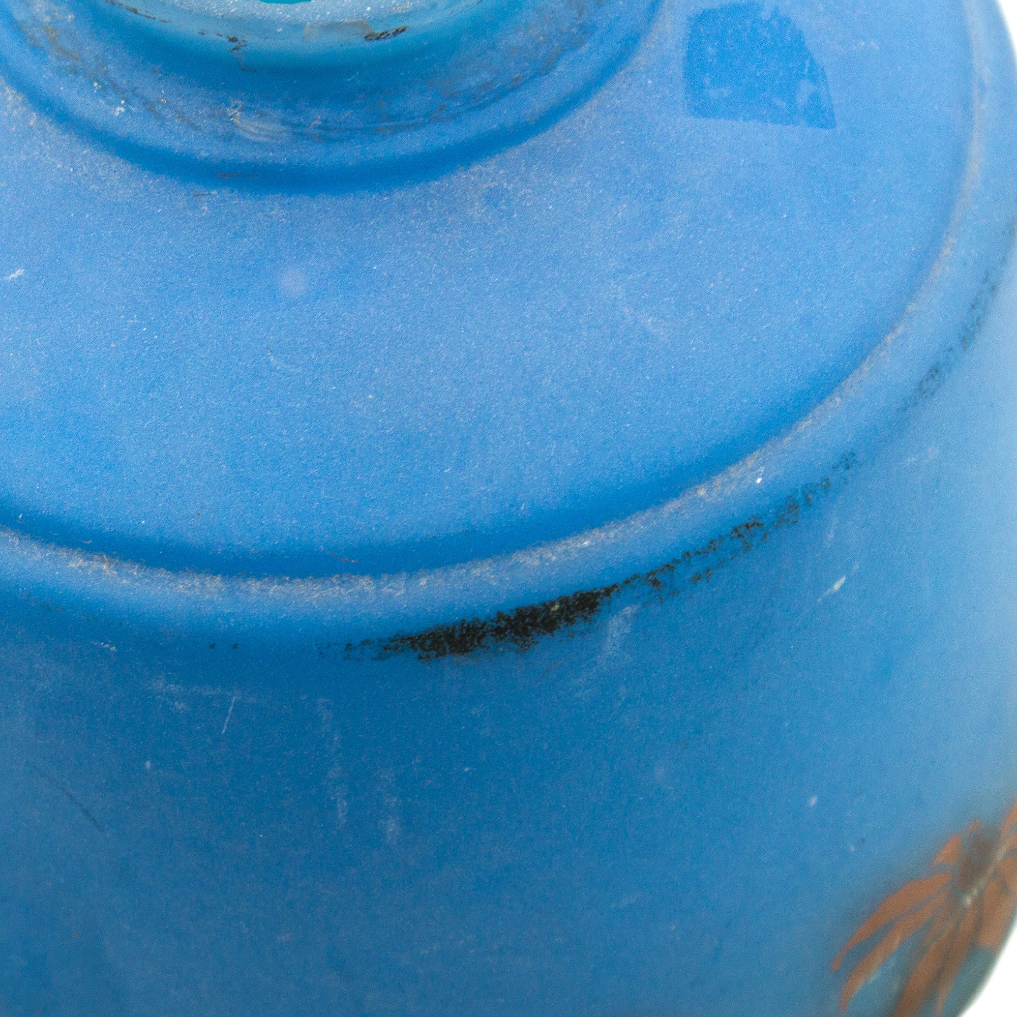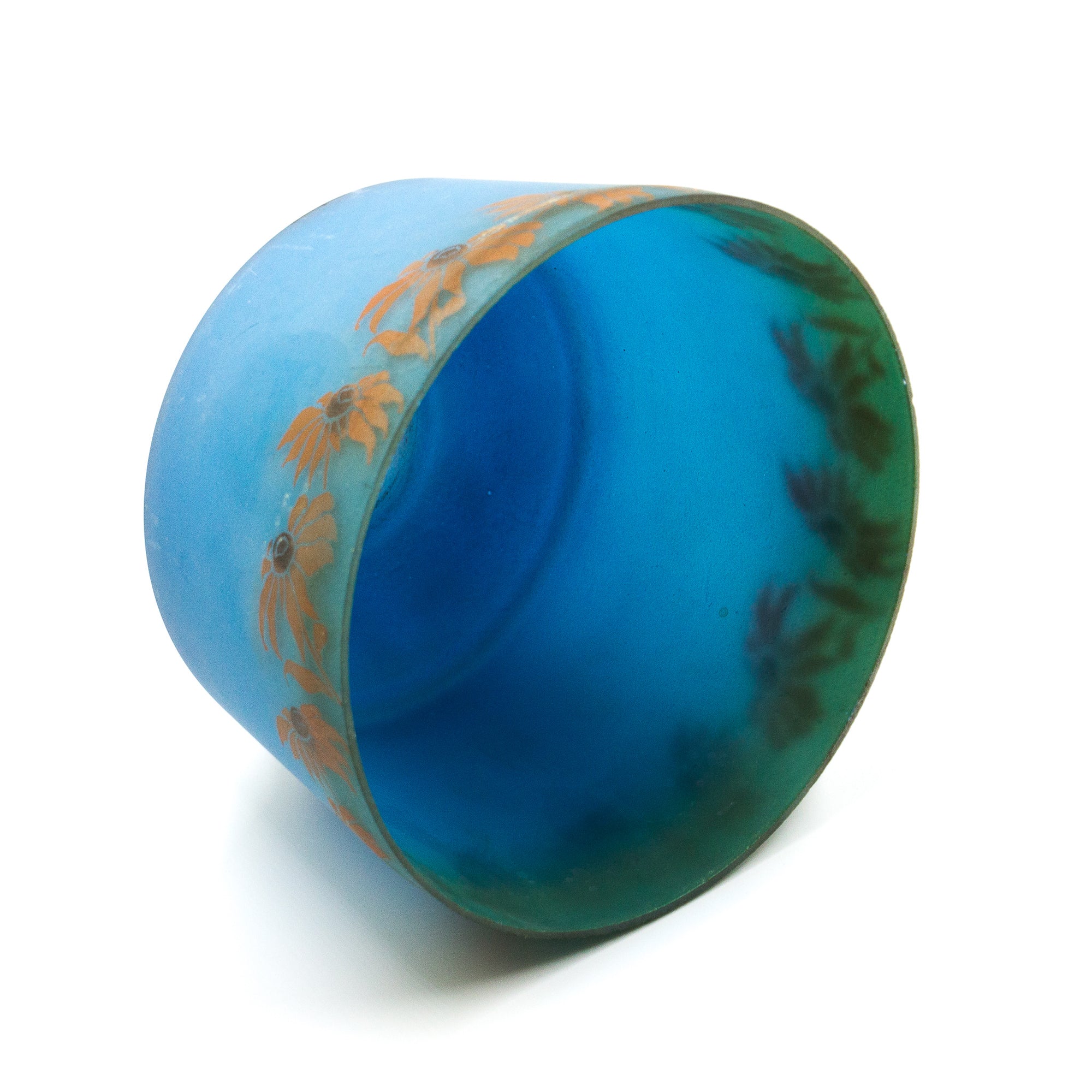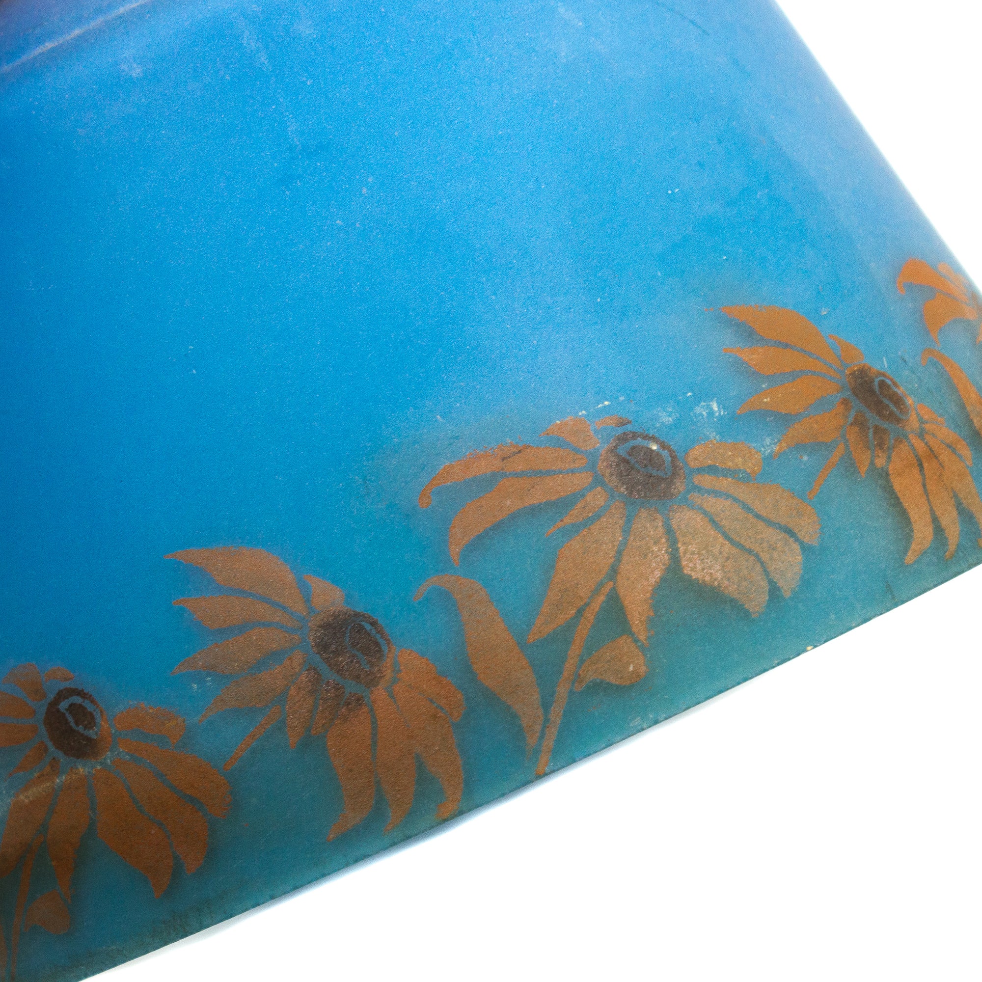 Beautiful, bright blue painted light shade with stenciled auburn flowers circling the rim. This shade is a stunning example of early painted glass c. 1930.