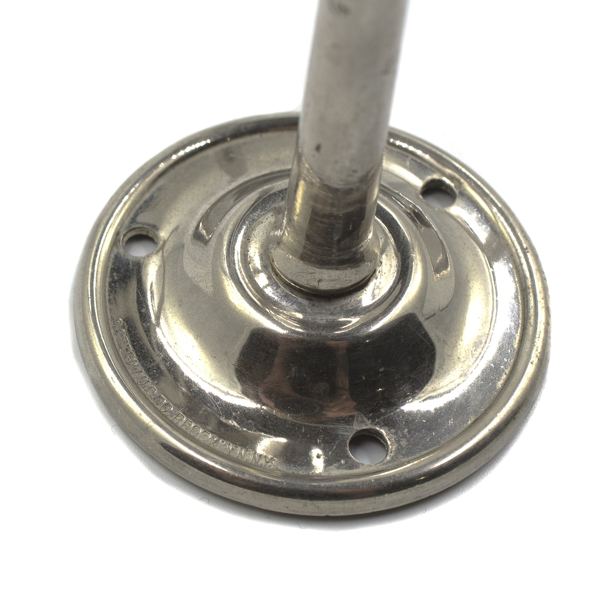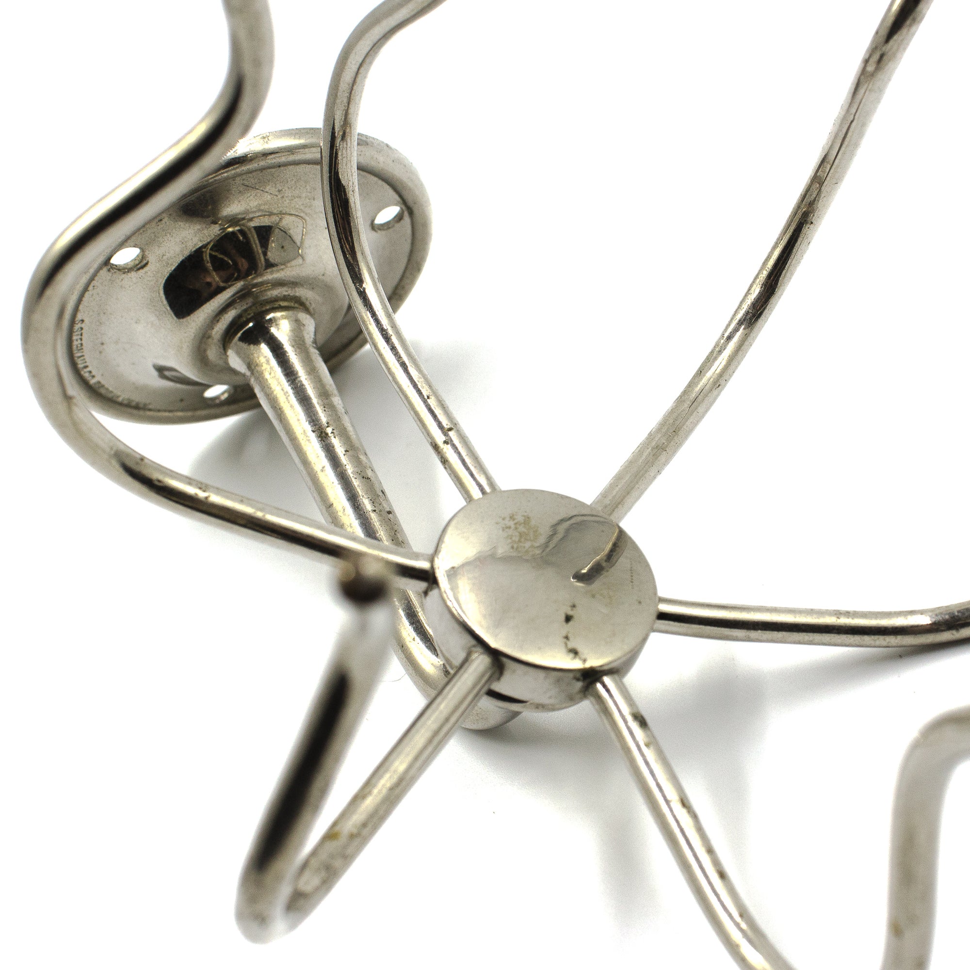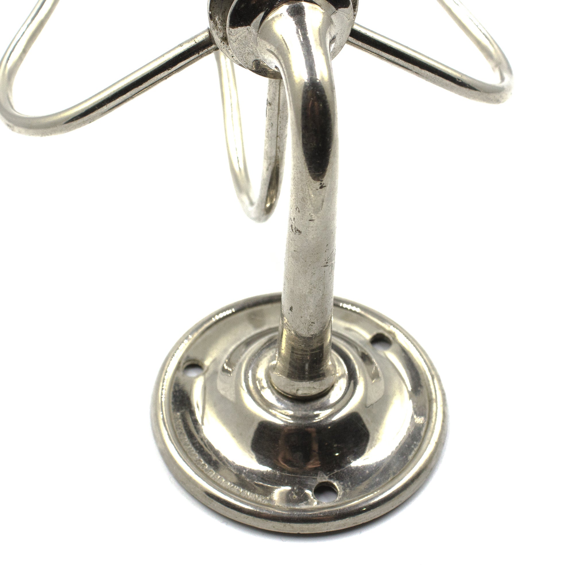 Here we have a lovely cup holder, featuring dramatic thin arms coming out in a wide bloom to hold the edges of a cup with just the inner most bend. Made by Sternau, a venerated turn of the century bathroom accessory manufacturer. Made of nickel plated cast brass.