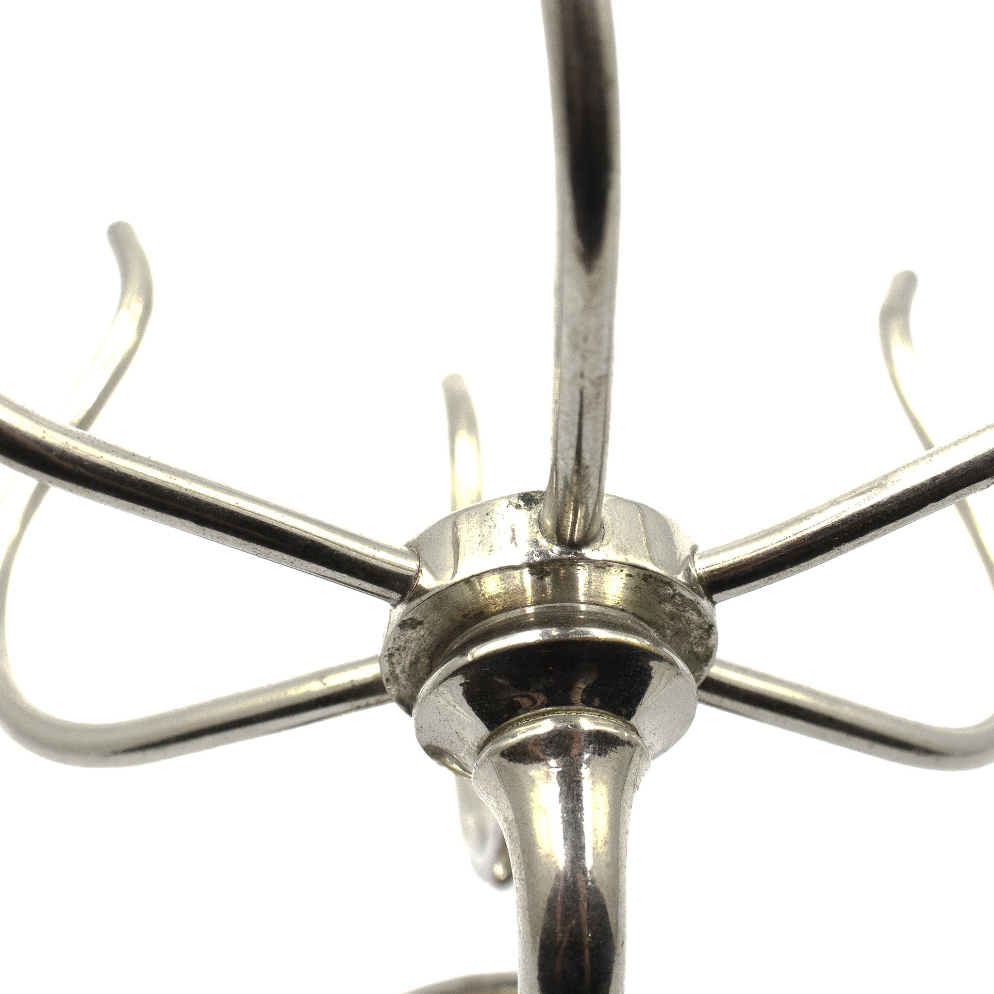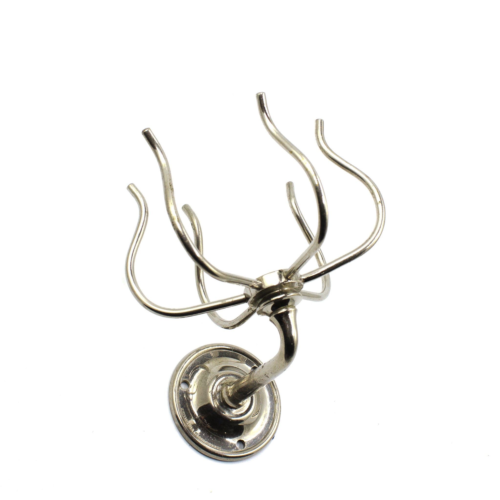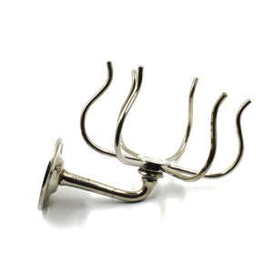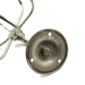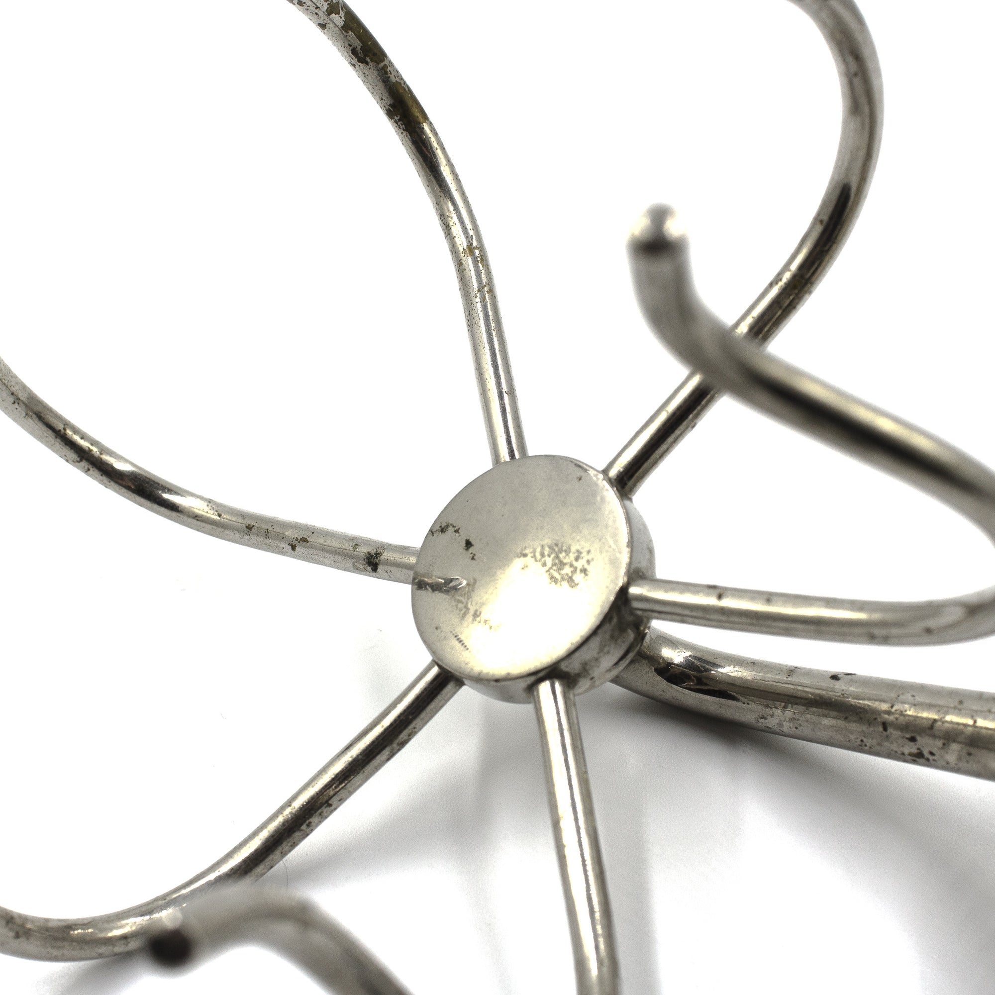 Here we have a lovely cup holder, featuring dramatic thin arms coming out in a wide bloom to hold the edges of a cup with just the inner most bend. Made by Sternau, a venerated turn of the century bathroom accessory manufacturer. Made of nickel plated cast brass.