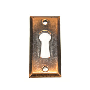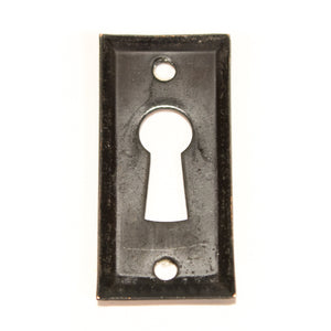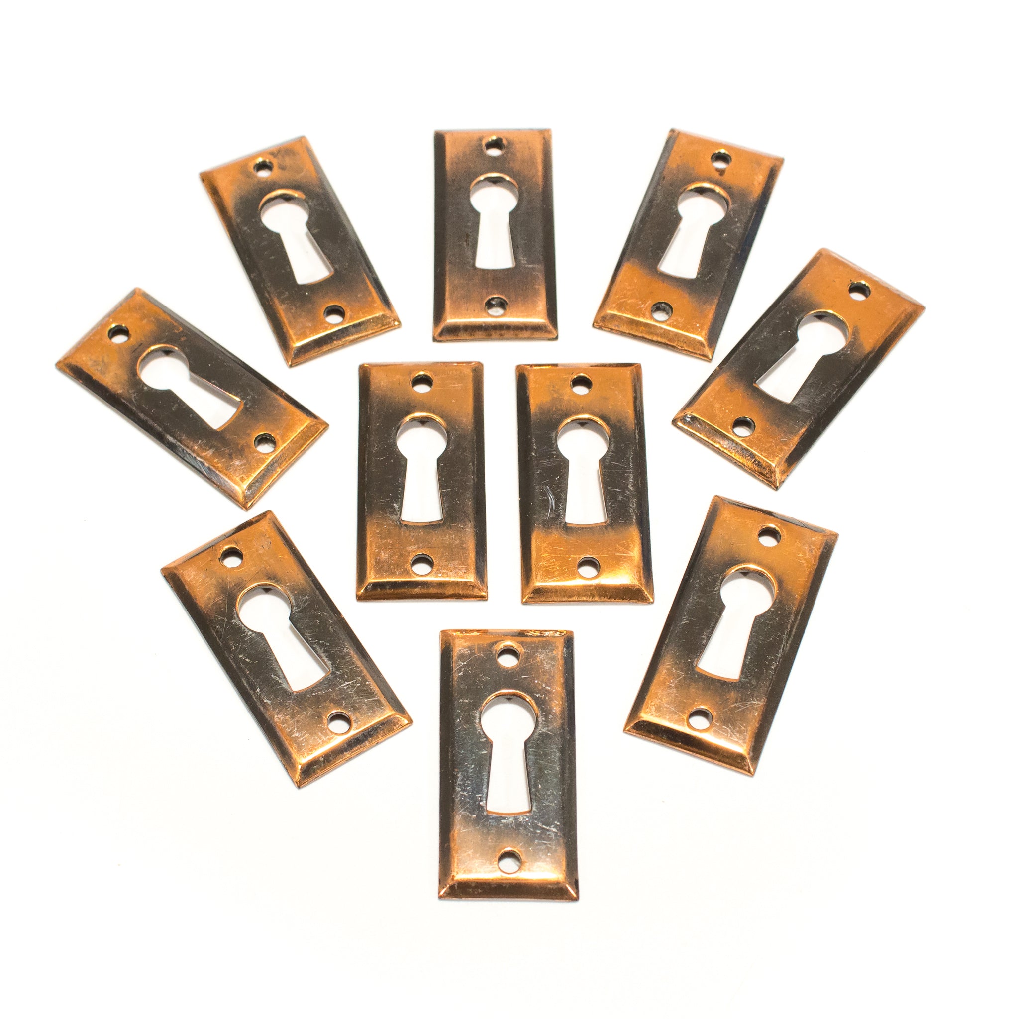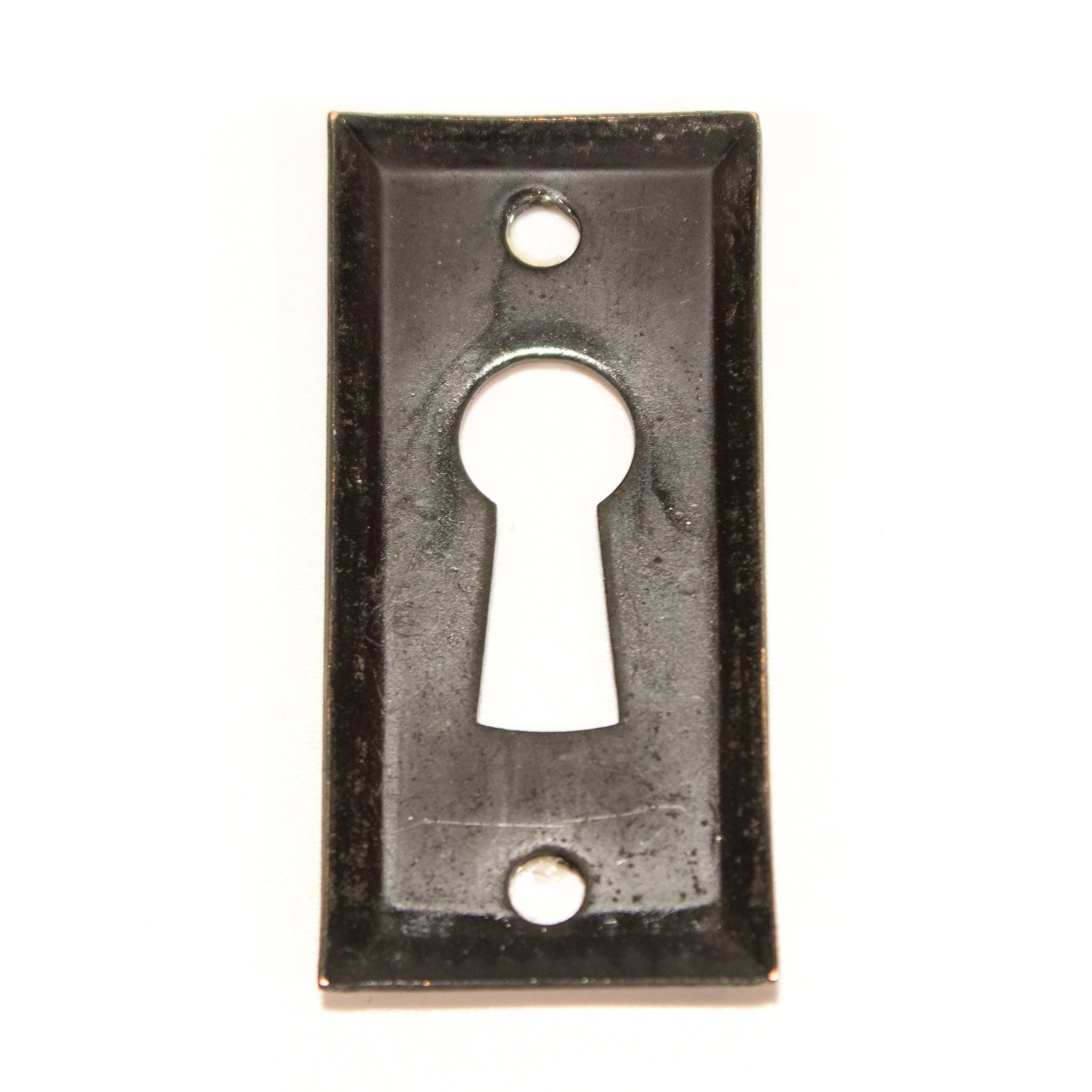 These new old stock Japan finish keyholes covers are elegant and classic with a subtle beveled edge. Theses were popular circa 1905 in middle and working class homes at the end of the Victorian era, foreshadowing the simple mission style to come next. Subtle variations in finish. Made of stamped steel.
