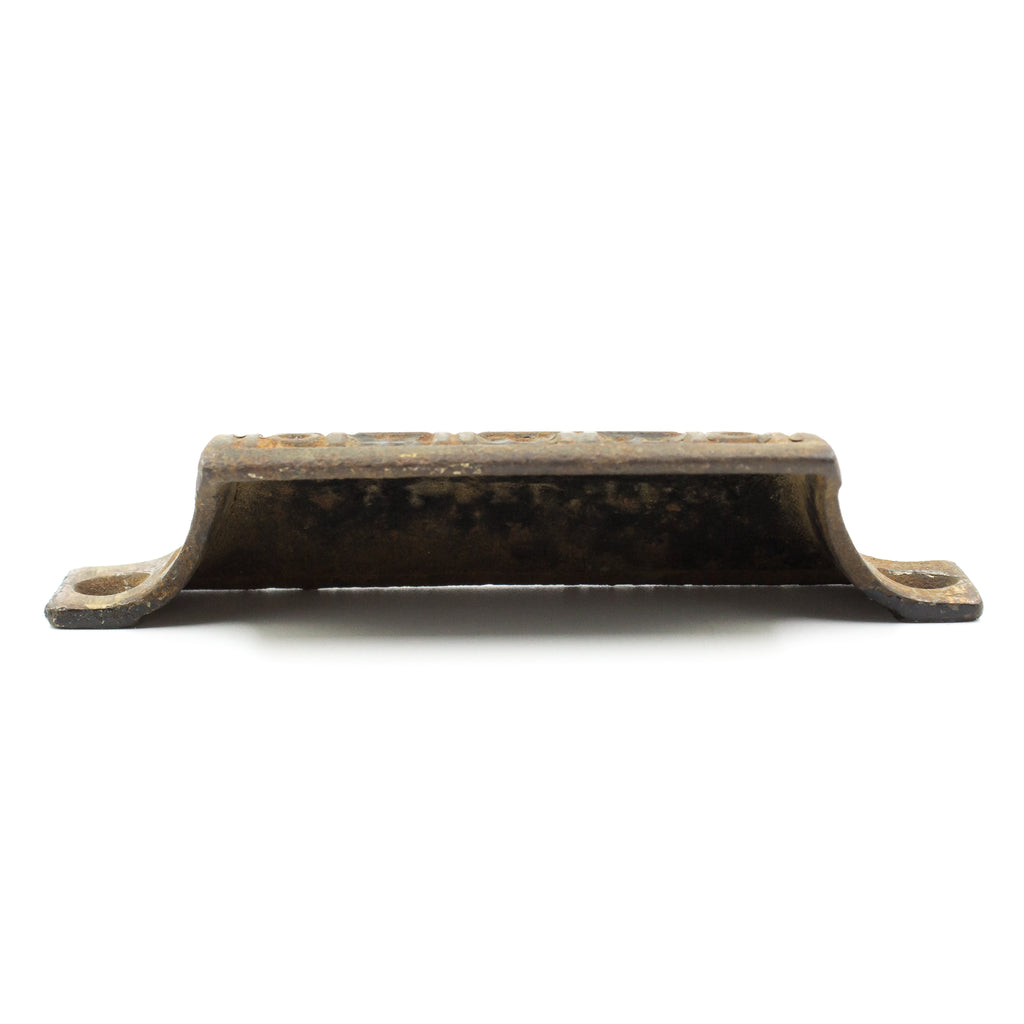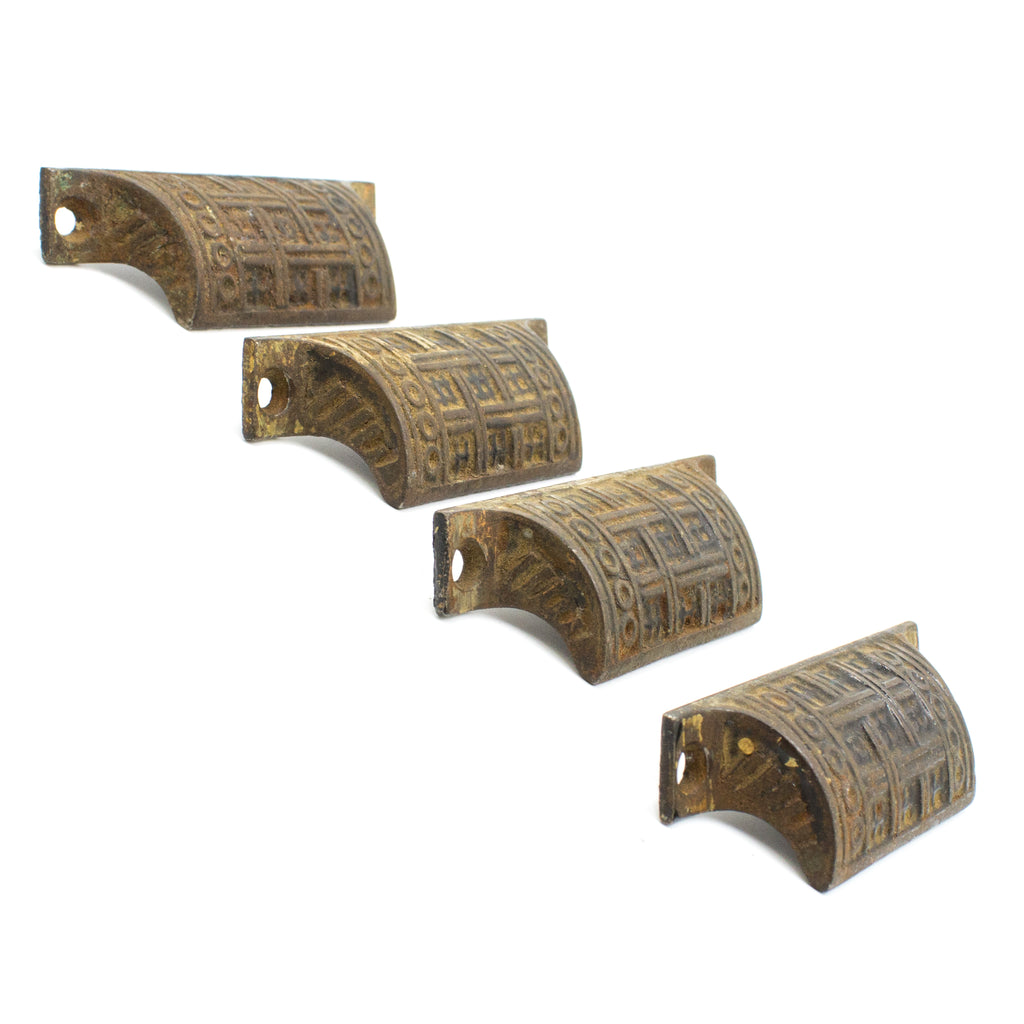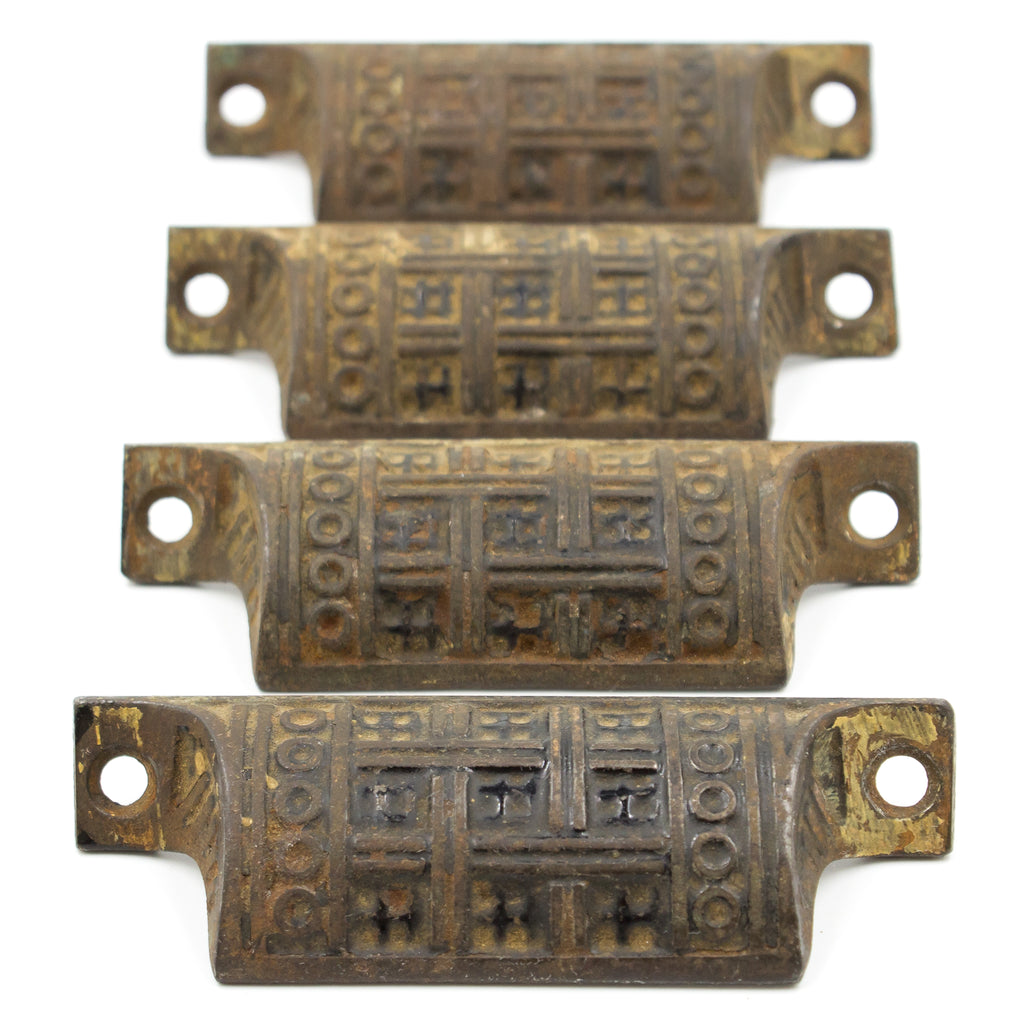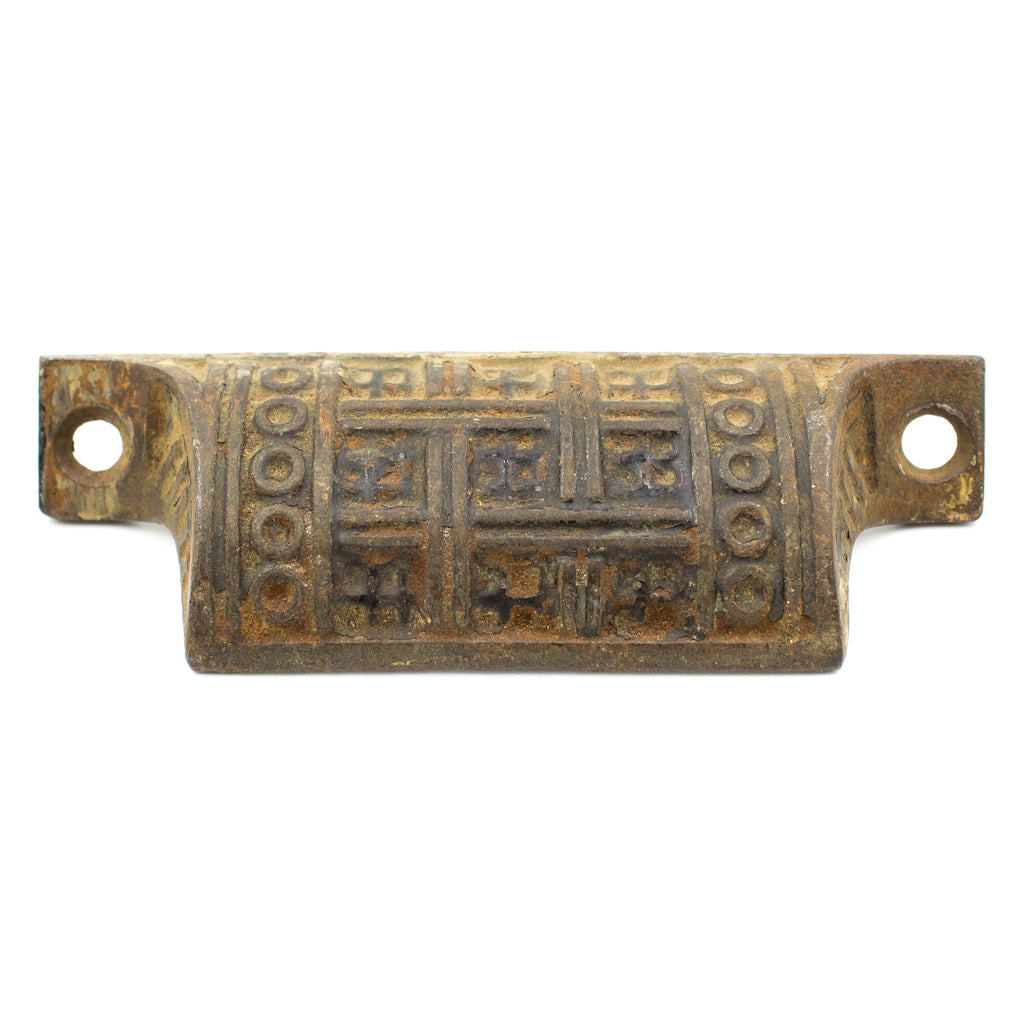 Ornate, deeply cast bin pulls features a geometric and linear design. These would be great in a Victorian home as well as something more modern. Sold individually.