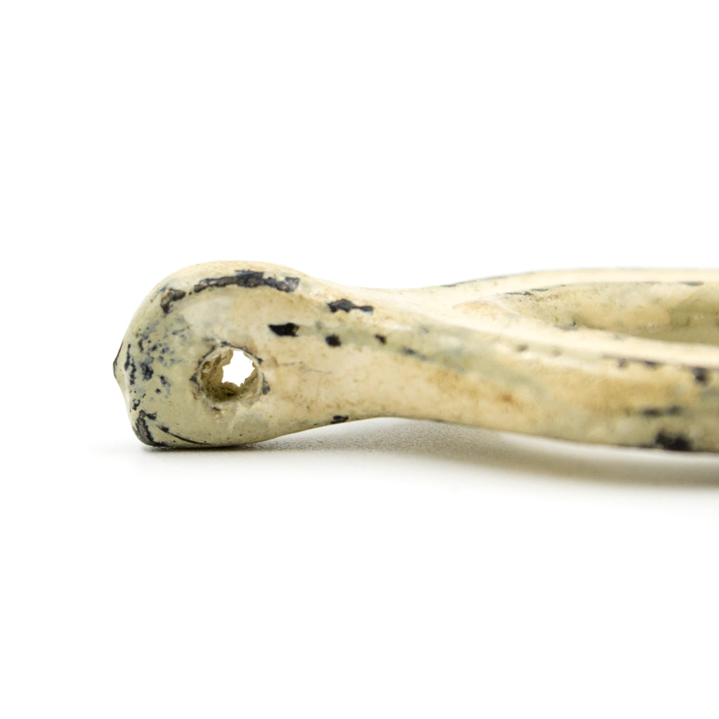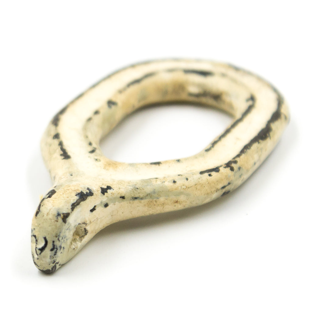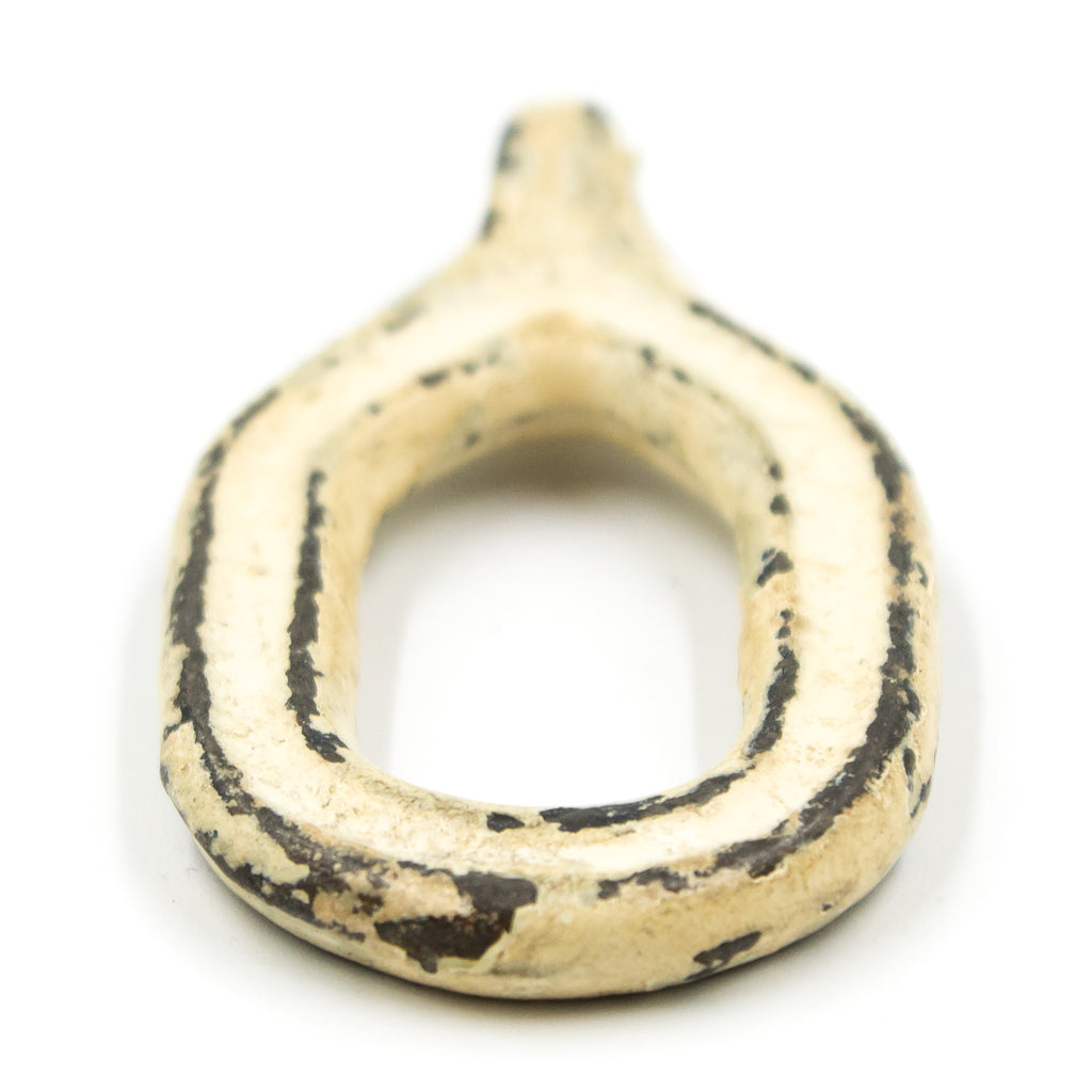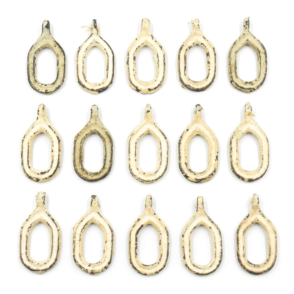 Shabby-chic/farmhouse-esque iron loops with lots of faded paint on them. These are made for curtains - sewn on the tops to slide over rods. However, we can see lots of reuse potential with the eye hole at the end! Sold individually.