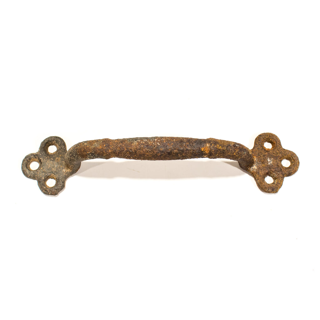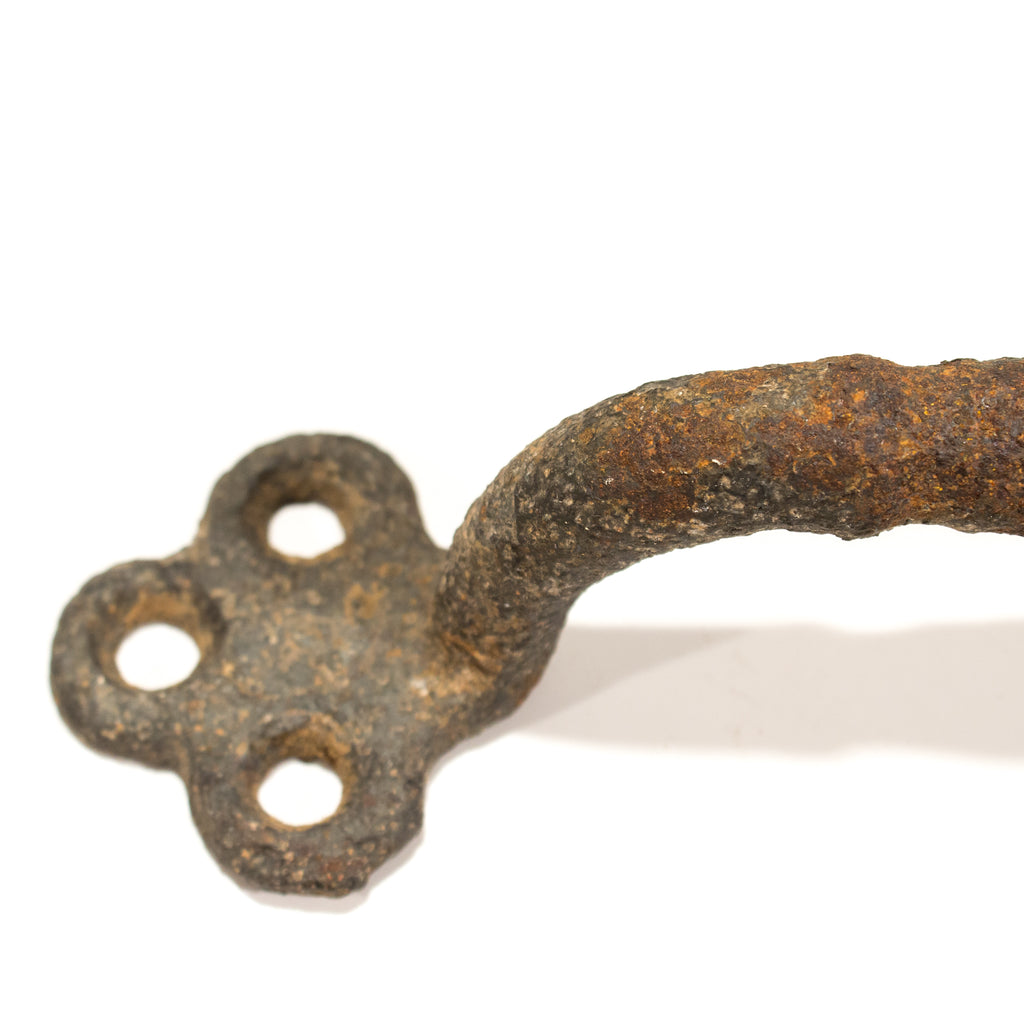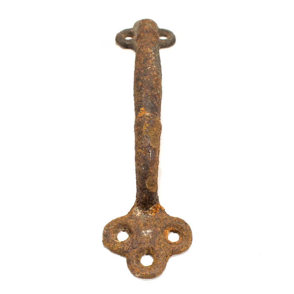 This oversized pull (over 9 inches!) has got stories to tell! The surface is heavily worn with dings, scratches, and overall unevenness that frequently signifies water exposure or being buried. This handle still forges on! Burly and sturdy, this would make a great gate, barn, or door pull for decades to come.