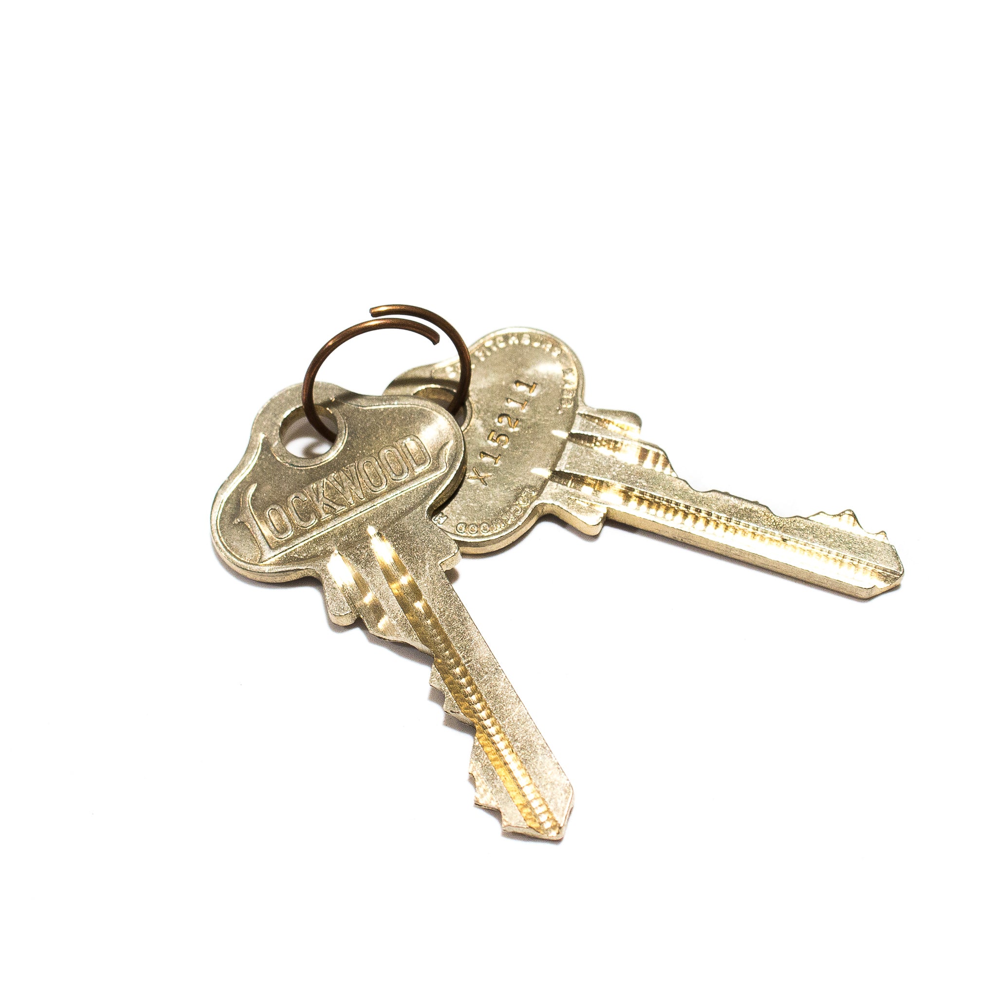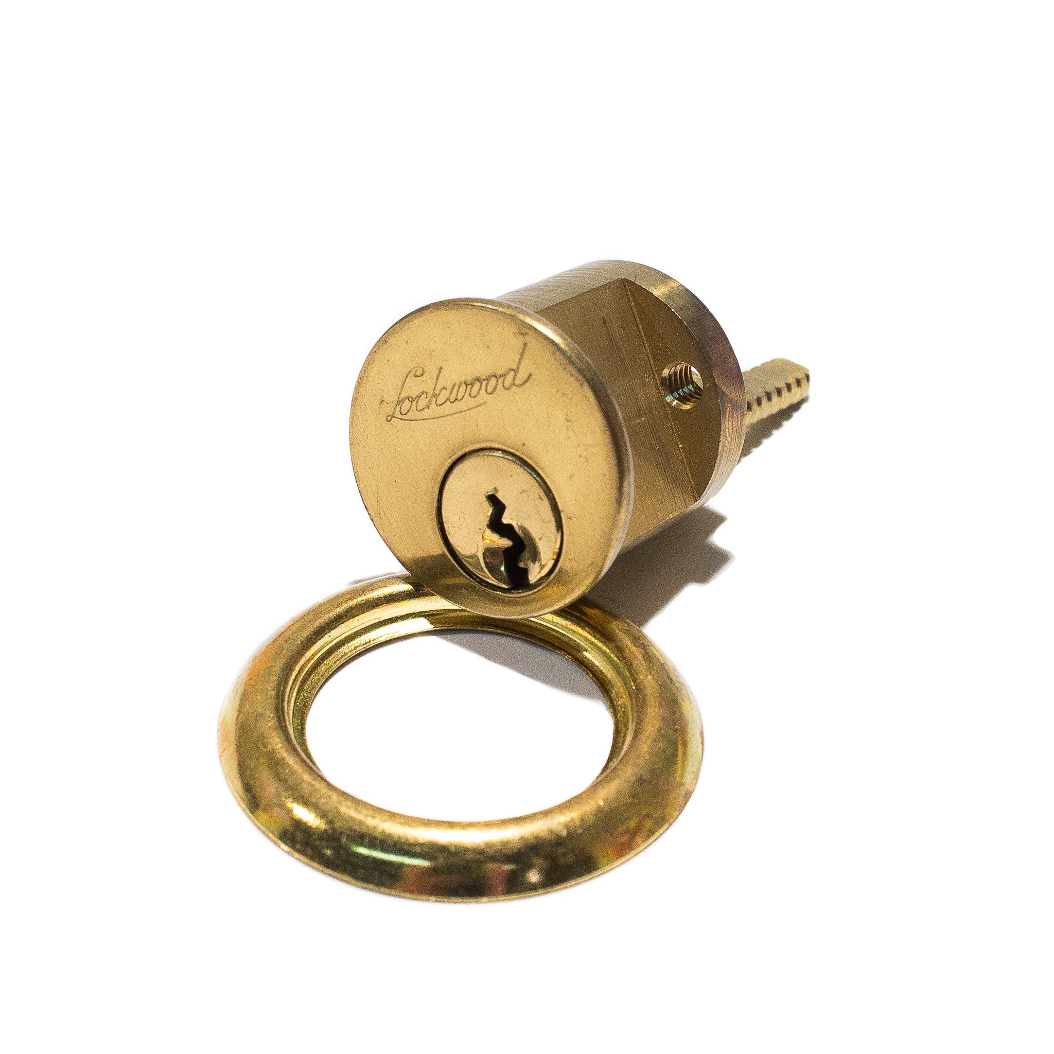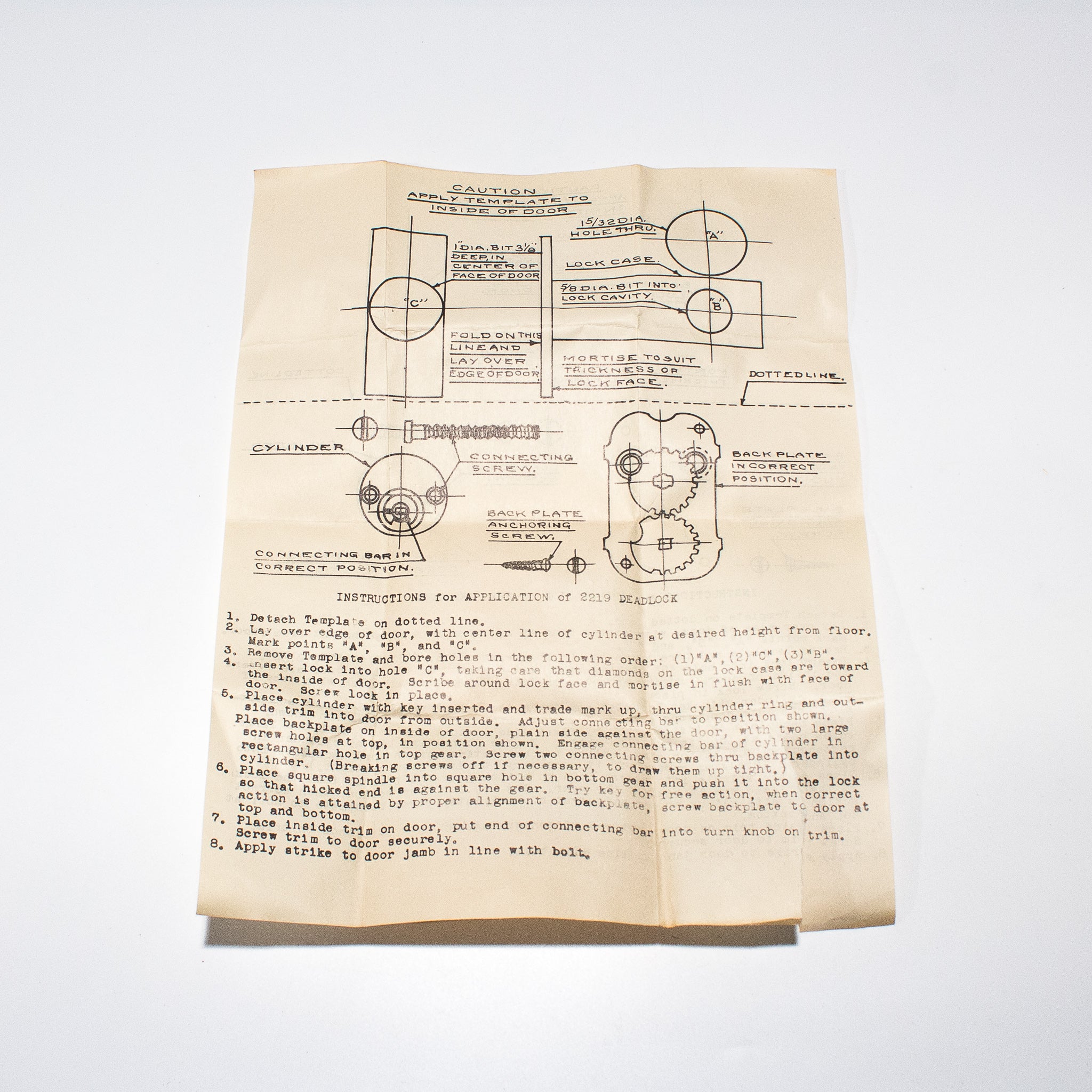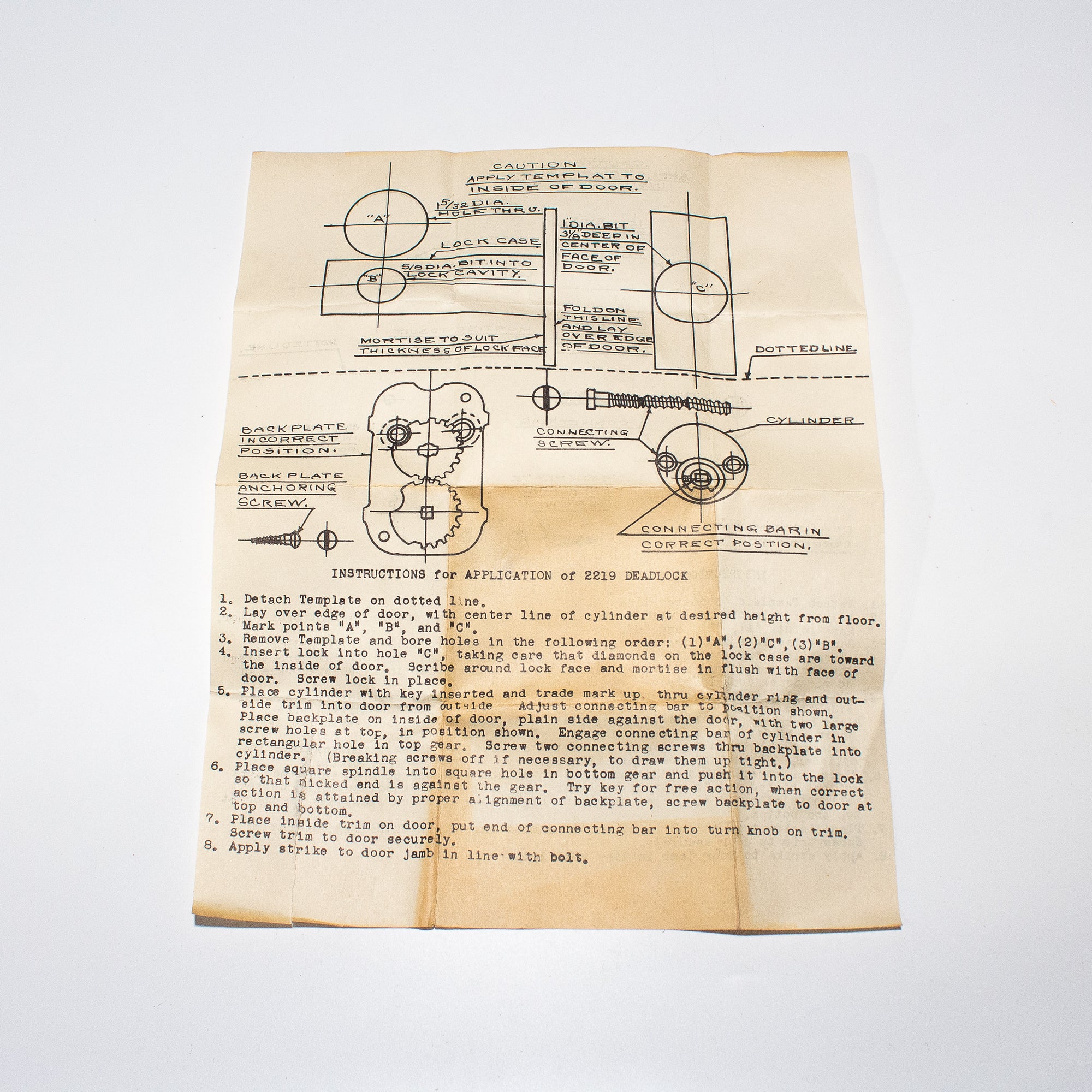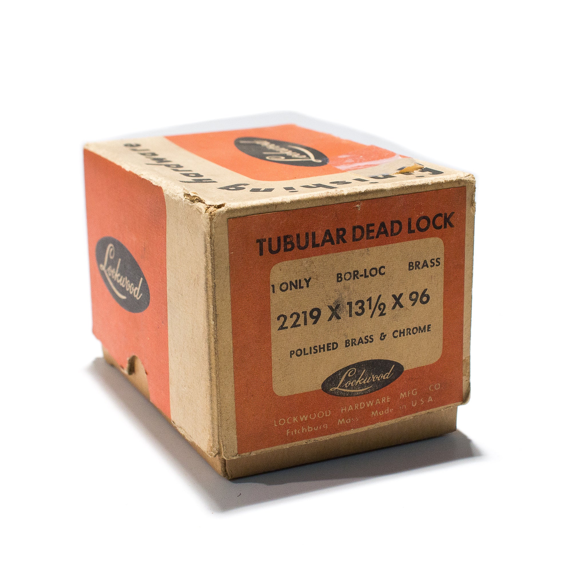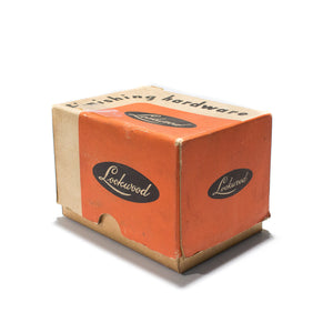 Great New Old Stock early Mid-Century deadbolt from Lockwood - including instructions and cool box! A great opportunity to get a complete new in the box set. Chrome interior turn bold and brass exterior cylinder. 2 sets available.