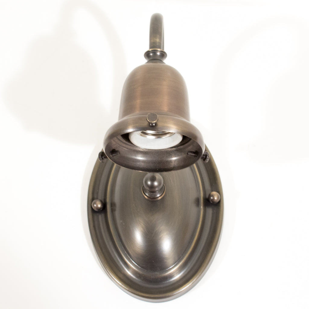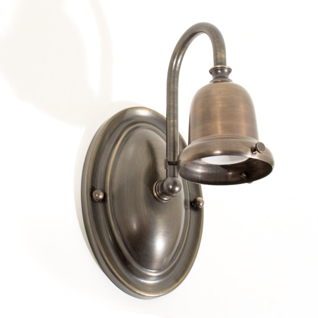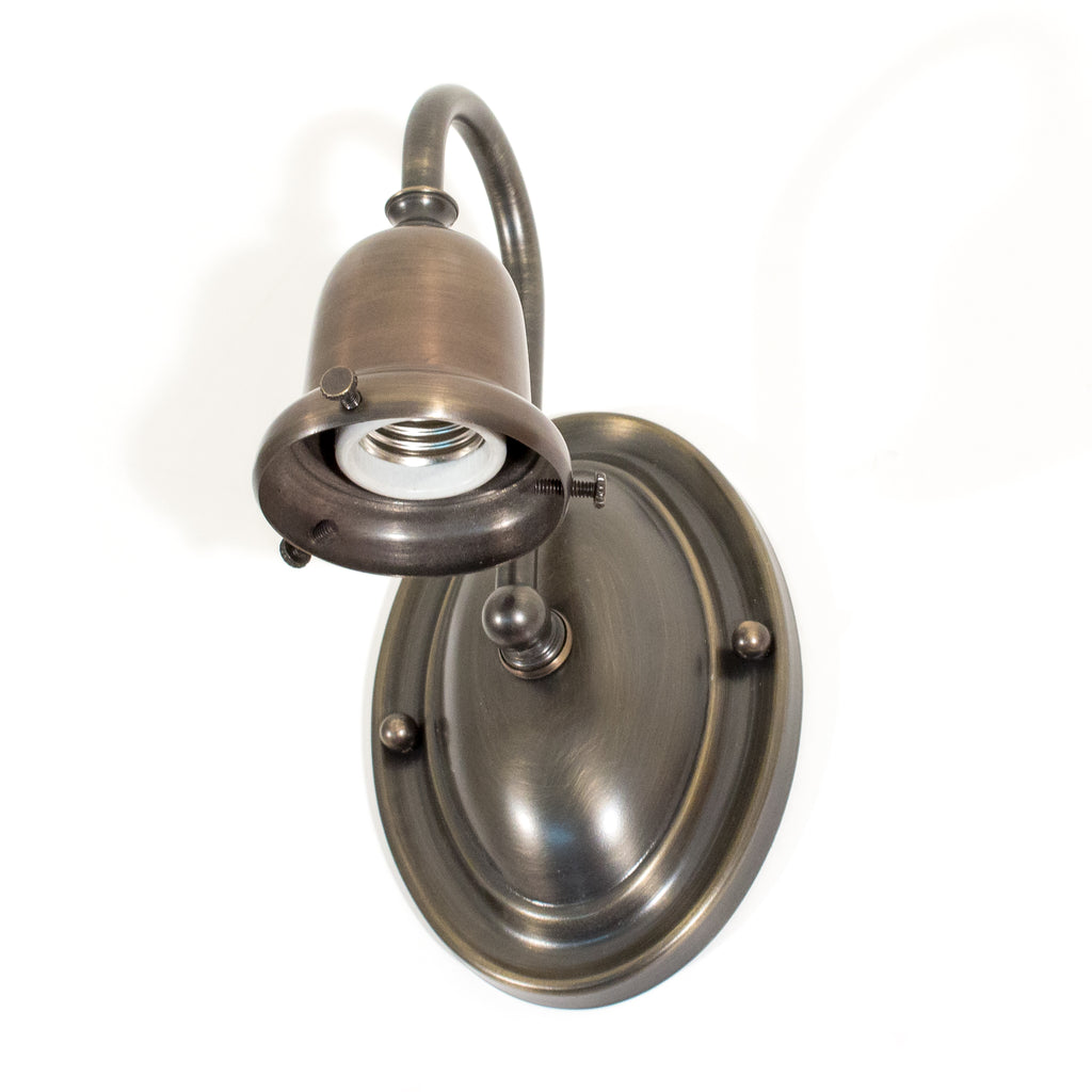 Our lighting shop produces these reproduction single arm wall sconces. Shown in three finishes, these classic fixture are an excellent accent to a vintage or modern home. Please contact us for customization needs (finish, fitter size, etc.) Note - Light finish not pictured.