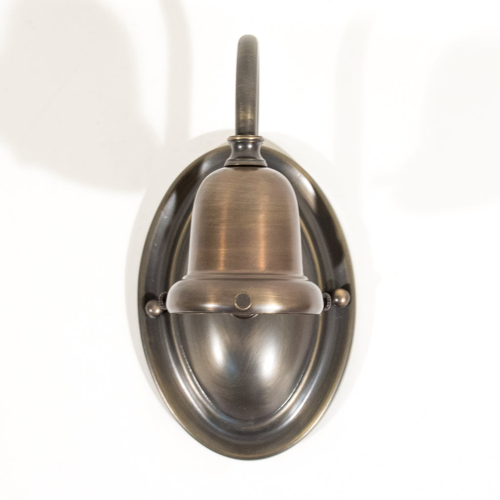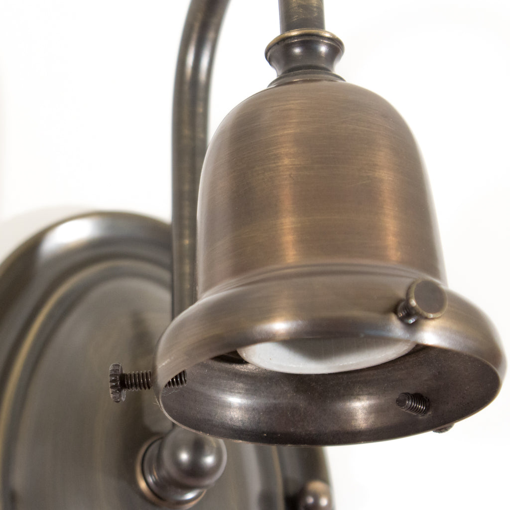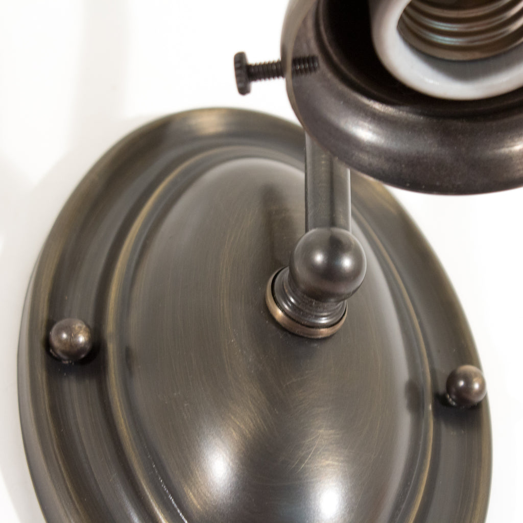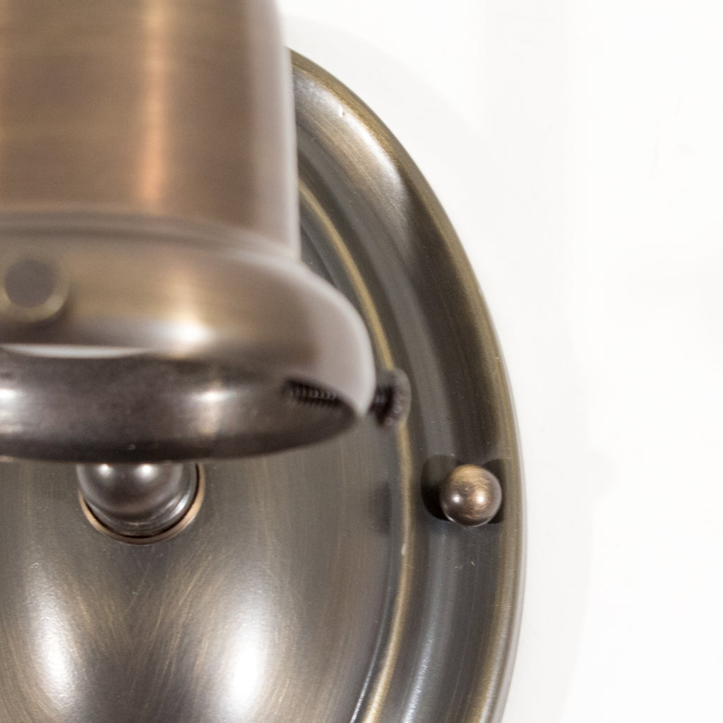Our lighting shop produces these reproduction single arm wall sconces. Shown in three finishes, these classic fixture are an excellent accent to a vintage or modern home. Please contact us for customization needs (finish, fitter size, etc.) Note - Light finish not pictured.
