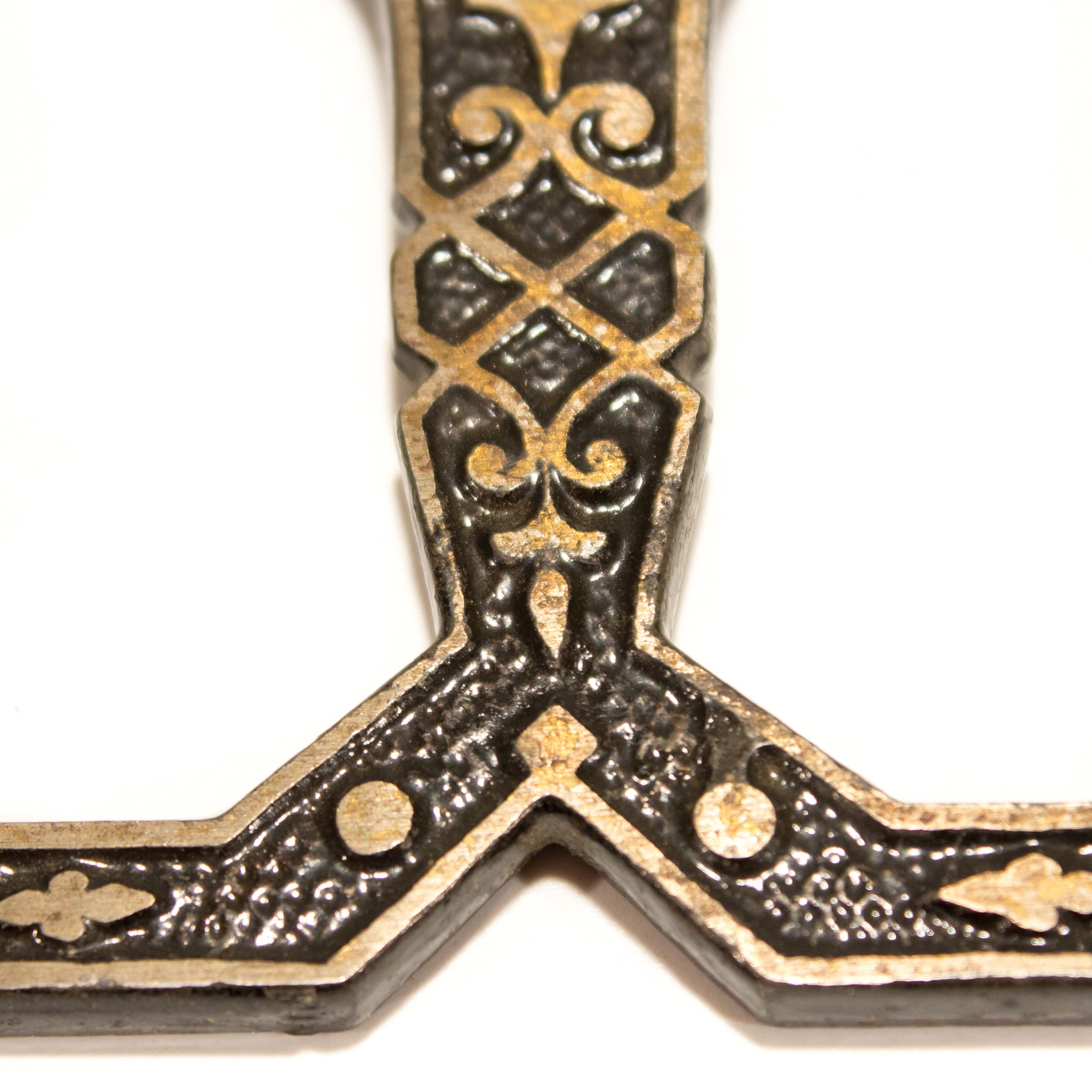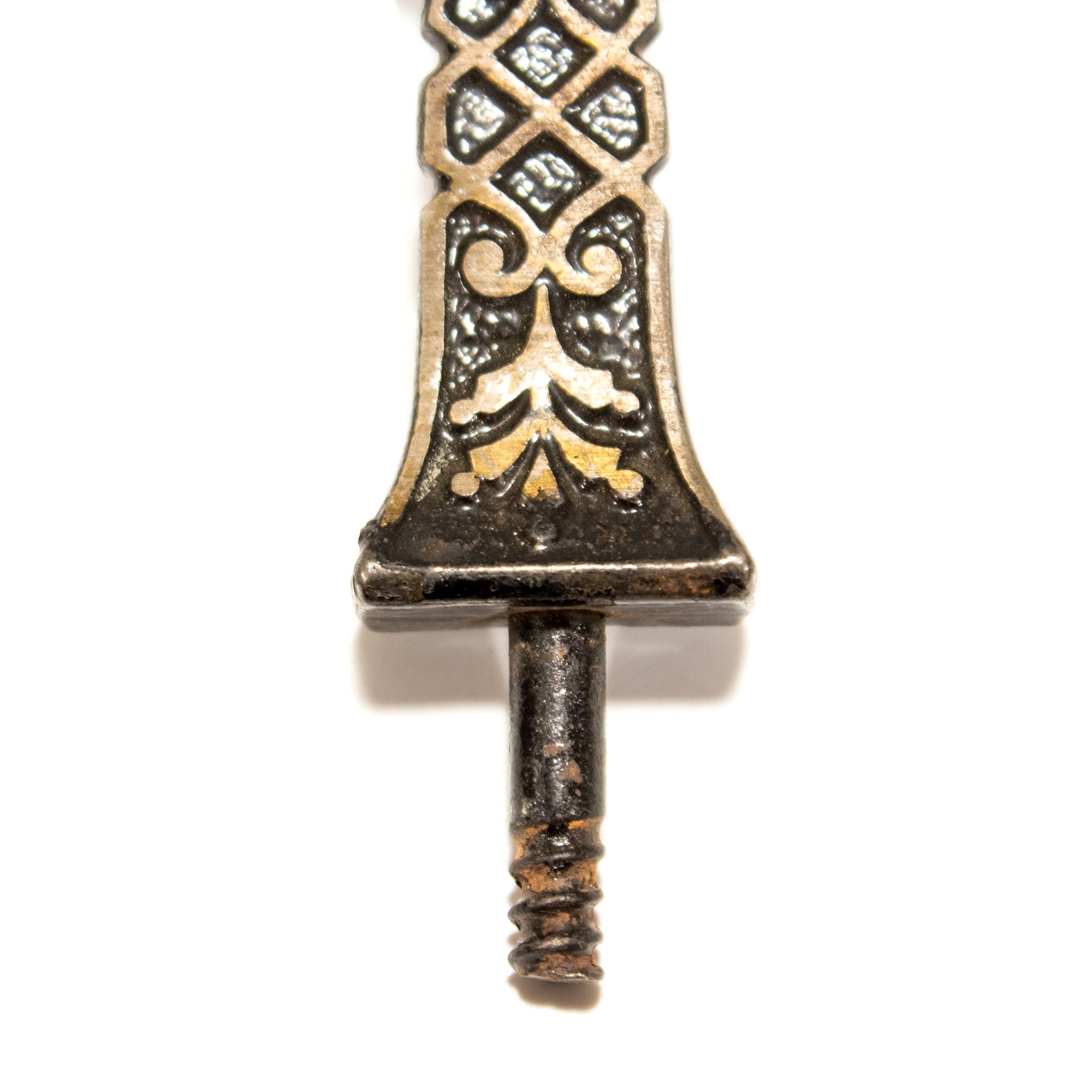 Heavy cast iron wardrobe style Victorian ceiling hook with deep cast surface design. Original black japanning (shiny black) coating mostly intact! Please note the tip of the wood screw has broken off.
